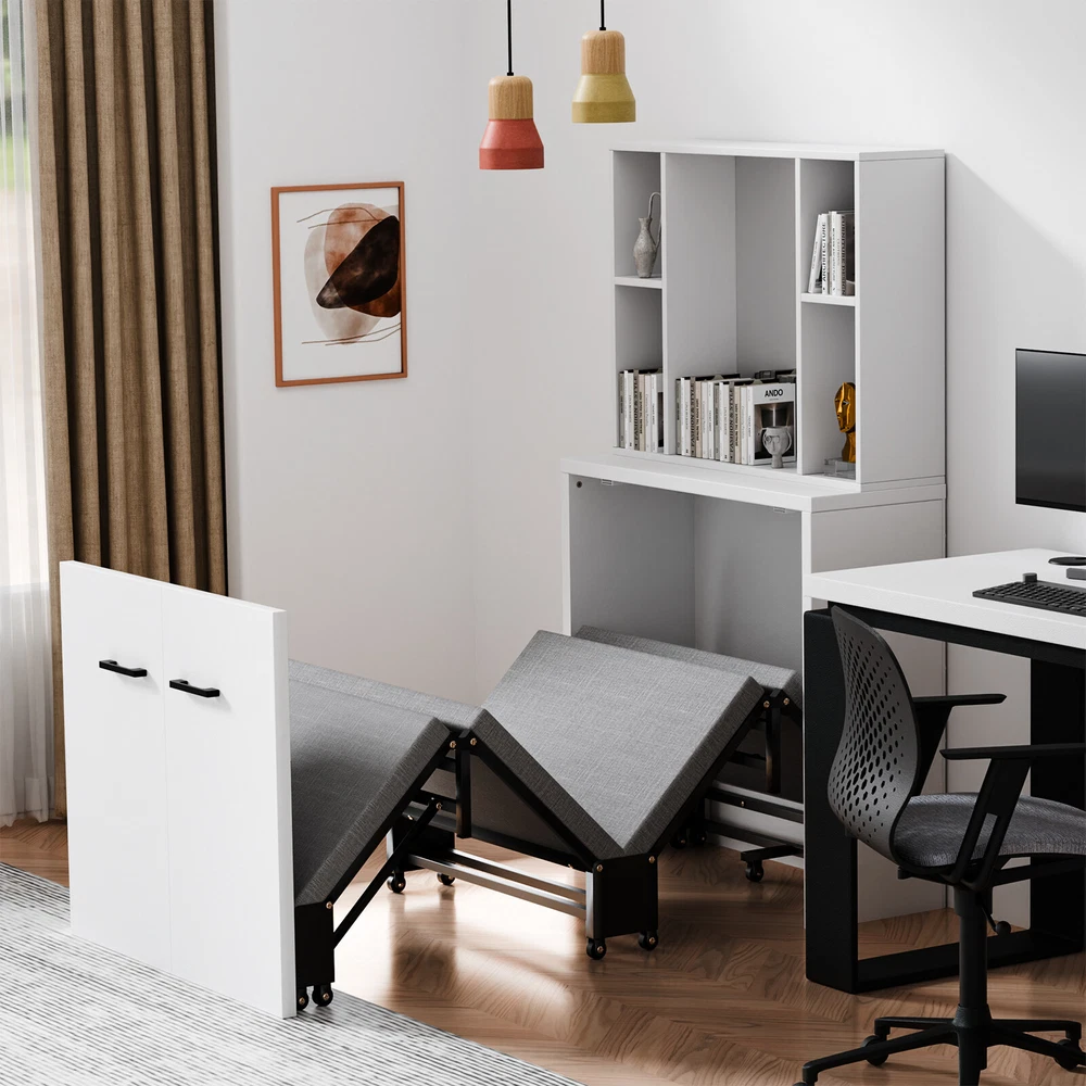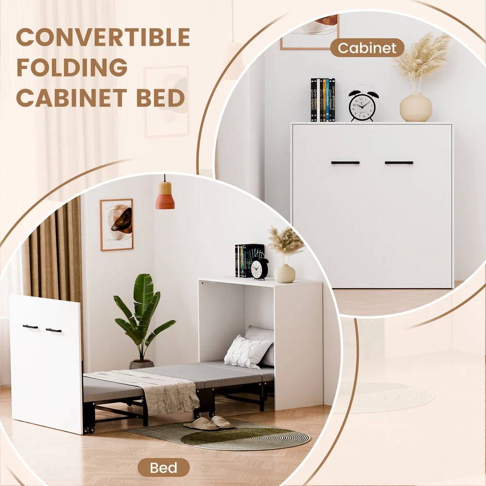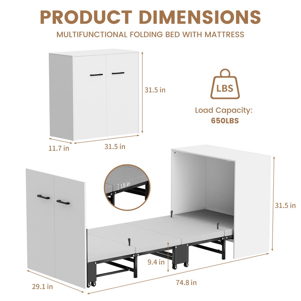 Multifunctional Cabinet Bed : Transform your living space with our innovative Murphy bed that seamlessly converts between a stylish cabinet and a comfortable rollaway bed. When not in use, it ensuring your home or office remains tidy and organized. Upon opening, it reveals a sleeping area designed to save you precious floor space Foam Mattress Included: Experience the perfect blend of comfort and support with our included foam mattress, boasting a thickness of 1.5 inches . it's an essential component of your versatile cabinet bed.Please note: The fold up bed dimensions are 74.8x29.1 inches .For those seeking additional cushioning, kindly consider the mattress size before making any adjustments Sturdy & Durable Design : Engineered with a robust four-fold mechanism and reinforced with an integral steel frame, our folding bed is built to last, capable of supporting up to 650 pounds . Whether you're lounging or sleeping, safety and stability are guaranteed. Smooth-rolling, high-quality wheels facilitate effortless maneuverability, making it a breeze to set up and store away Effortless Quick-Fold System : Embrace convenience at its finest with our tool-free folding system.In moments, transform your cabinet into a cozy bed with a simple pull. Packing it back up is equally as straightforward, ensuring your living area returns to its neat state without hassle Versatile & Space-Saving: Ideal for modern living, our compact cabinet bed measures just 31.5x11.7x31.5 inches when folded , making it an excellent fit for various settings. Use it in your office for quick breaks, stash it in the attic or a small room as a temporary bed solution, or welcome unexpected guests with elegance