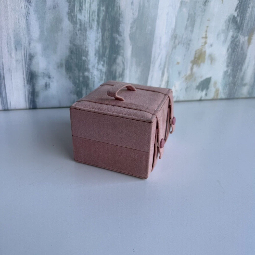 This is a small pink jewelry box with compartments and a snap closure. It is made of faux leather and velvet, suitable for storing various types of jewelry like necklaces, bracelets, and earrings. The travel jewelry case includes small compartments for organization and is designed for women. It is not vintage or personalized, and is suitable for keeping jewelry safe while traveling.n