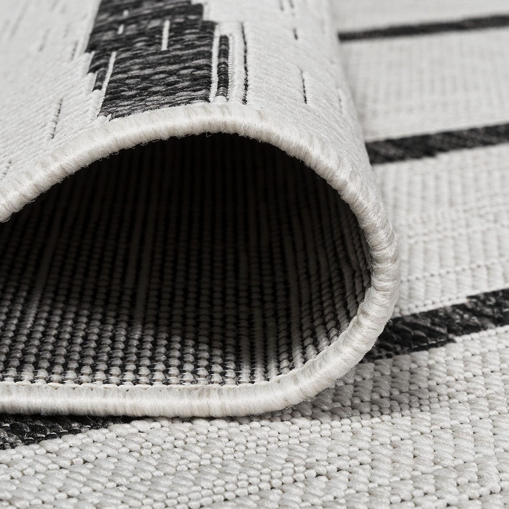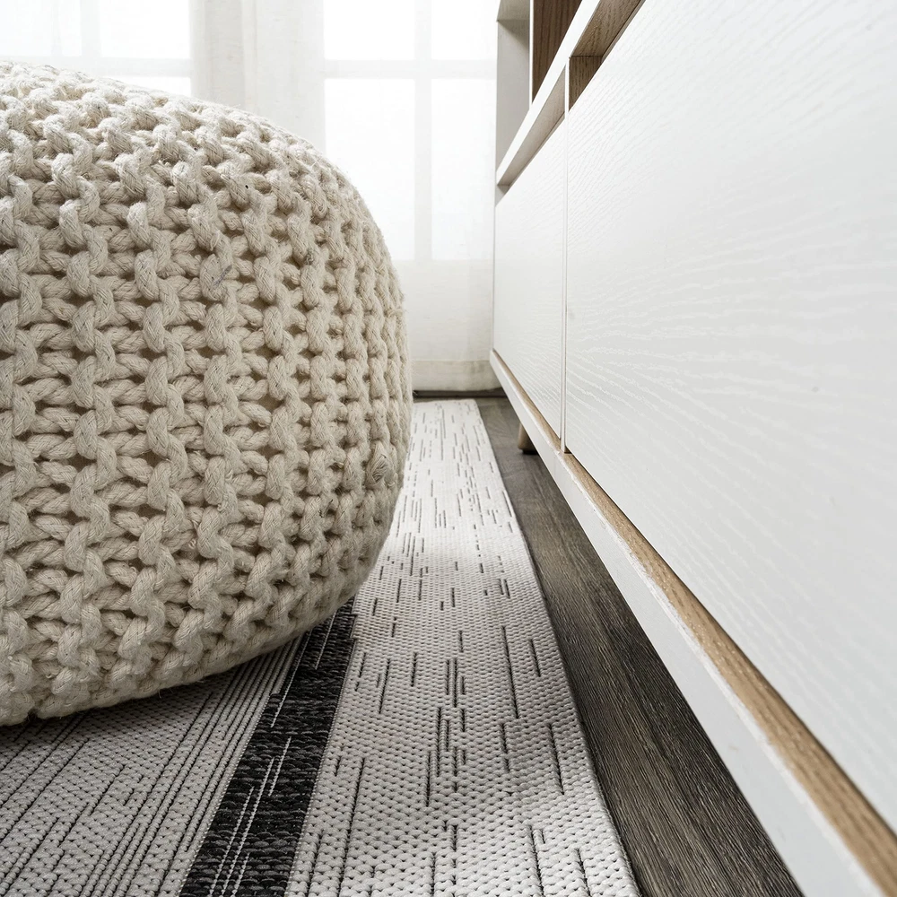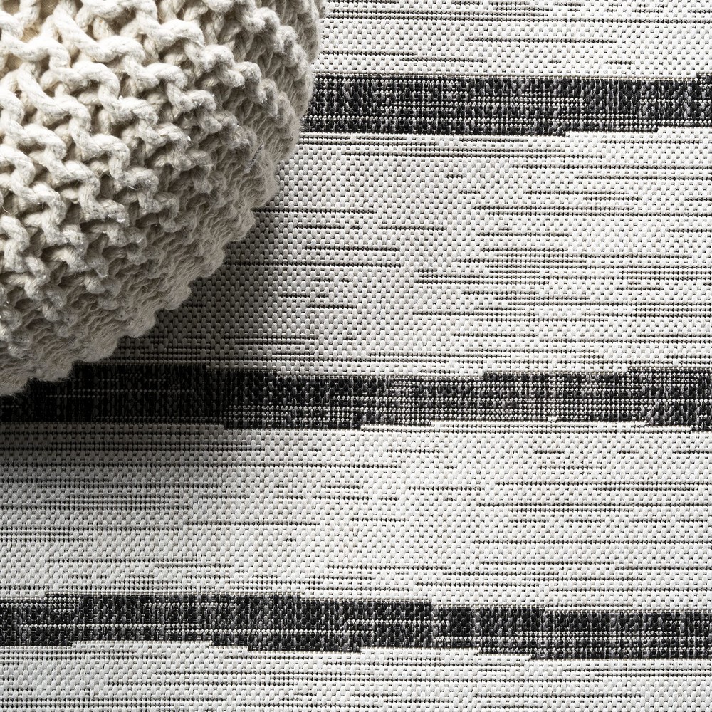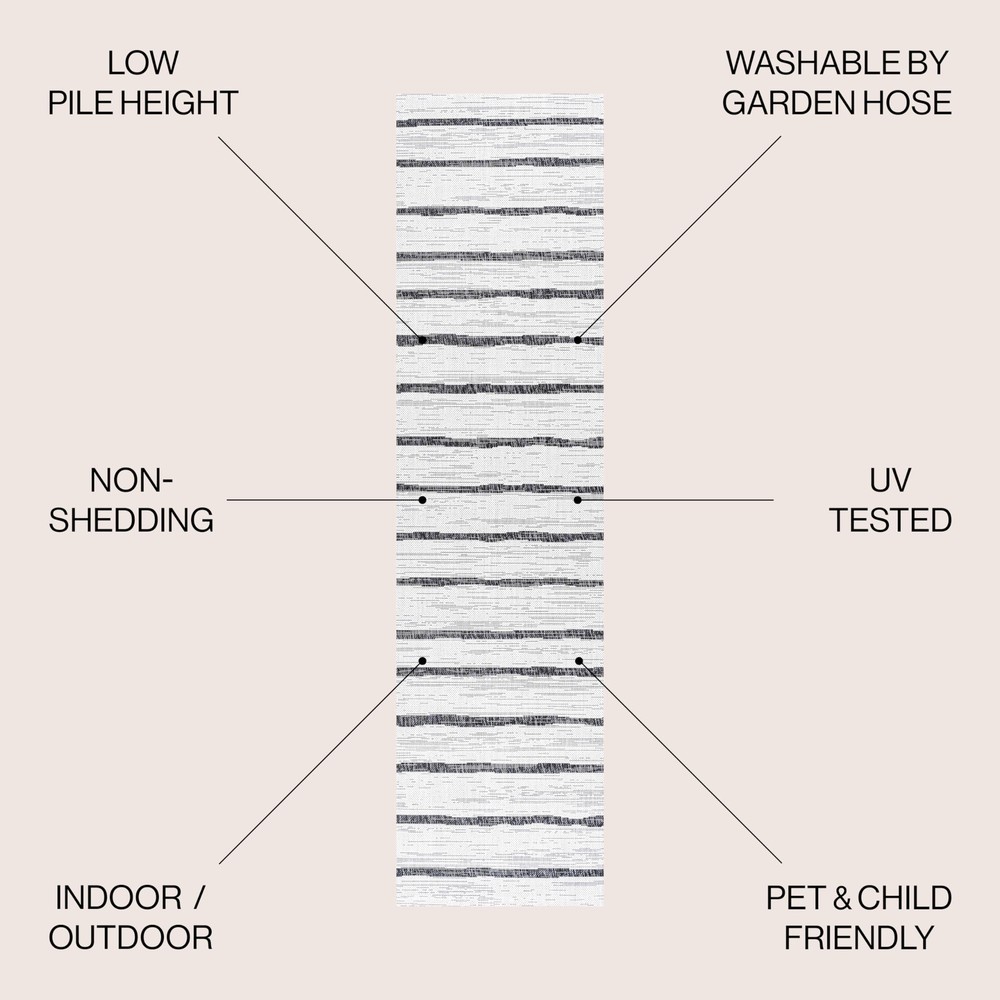 Inspired by Berber rugs, our modern striped rug has a soft, low pile. The scattered stripe pattern recalls the tribal rug designs made popular by mid-century design. With its easy-care fibers, this versatile rug is ideal for a living room, dining room, entry or bedroom. INDOOR/OUTDOOR DURABILITY: Give your patio, deck or porch an instant makeover with an indoor/outdoor rug; Low-pile synthetic rug fibers are durable for high-traffic spaces like the kitchen, mud room or entry; Perfect for families with STAIN-RESISTANT AND PET-FRIENDLY: This rug is made from synthetic fibers that resist UV fading; The pet-friendly low-pile construction won’t accumulate dirt, and spills clean up easily; It’s been machine-woven so the rug fibers will stay put EASY TO CARE FOR: To wash an outdoor rug, spray the surface with a 5-1 mixture of mild dish soap and water; Then rise thoroughly with a garden hose and hang over a railing to dry thoroughly Power loomed with a 0.19" pile that's soft and durable The woven ivory and soft black color scheme brings a modern touch to this timeless rug