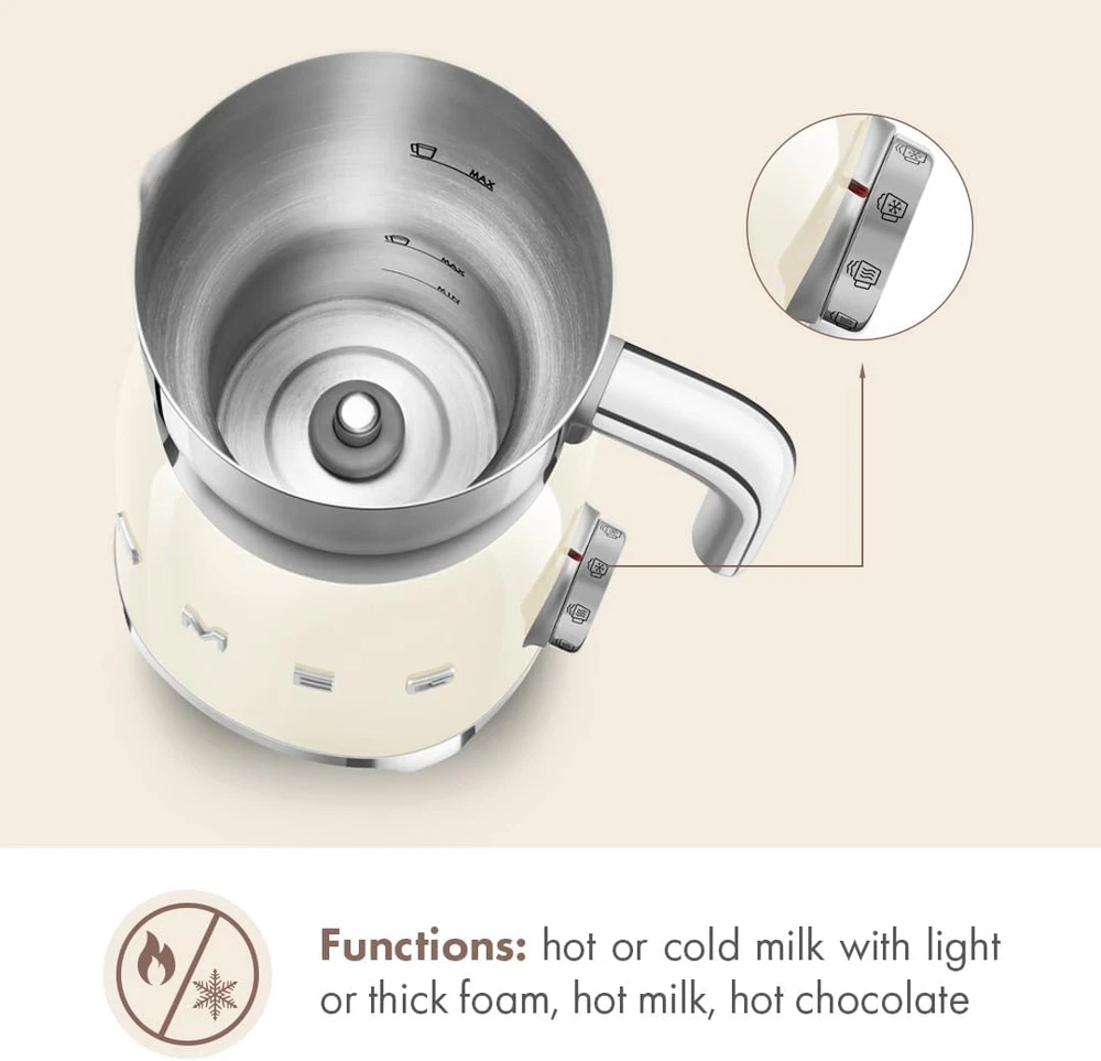 Store New Arrivals Add to Favorite View Feedback Contact SMEG Retro 50'S Style Milk Frother with 2 Disks 6 Preset Programs Hot or Cold Frothing and Induction Heating (Cream) Description Item model number MFF11CRUS Wattage 500 watts Capacity 1.3 Pounds Color Cream Included Components Frothing Disk, Milk Frother, Mixing Disk, User Manual Product Dimensions 9.17 x 9.17 x 13.27 inches Material Stainless Steel Item Weight 2 pounds Model Name SMEG Milk Frother Recommended Uses For Product Residential Manufacturer SMEG Special Feature Auto Shut-Off, Induction Heating, Non-Slip, See-Through Lid Brand Smeg Product Care Instructions Hand Wash Only Size 20 oz Sleek Stainless-Steel Design: Comes with a removable stainless-steel jug for easy pouring and cleaning Efficient Induction Heating: Quickly heats milk to your desired temperatu Versatile Frothing Options: Choose between hot or cold milk with light or thick foam settings. Easy-to-Use Controls: Features a user-friendly control panel with a backlit knob for easy adjustments. Stable Design: Anti-slip feet provide stability during use. Tritan Lid: Comes with a Tritan lid featuring a built-in measuring cup. The Tritan Renew material offers the same durability and safety, now with 50% certified recycled content Convenient Storage: Includes a built-in cord wrap for tidy storage. Holds up to 20 fl. oz. Dimensions: 7" x 6" x 10" high Experience the perfect blend of vintage charm and modern functionality with the SMEG Electric Milk Frother. Celebrated for its iconic '50s-inspired design, this Italian brand collaborates with top architects to create stylish and functional kitchen appliances. The stainless-steel frother uses an induction heating system to quickly warm milk to your desired temperature. Whether you prefer a smooth microfoam or fluffy peaks, this frother delivers excellent results with both hot and cold milk, perfect for any beverage. Sleek Stainless-Steel Design: Comes with a removable stainless-steel jug for easy pouring and cleaning. Efficient Induction Heating: Quickly heats milk to your desired temperature. Versatile Frothing Options: Choose between hot or cold milk with light or thick foam settings. Easy-to-Use Controls: Features a user-friendly control panel with a backlit knob for easy adjustments. Stylish Color Choices: Available in a variety of colors to complement other SMEG appliances in your kitchen. Dimensions: 7" x 6" x 10" high. Capacity: Holds up to 20 fl. oz. Weight: Weighs 2 lbs. Power: 500W. Stable Design: Anti-slip feet provide stability during use. Tritan Lid: Comes with a Tritan lid featuring a built-in measuring cup. The Tritan Renew material offers the same durability and safety, now with 50% certified recycled content. Convenient Storage: Includes a built-in cord wrap for tidy storage ABOUT US We offer the best prices around on high quality products. Our E-store includes media such as books, movies, music and games while offering electronics, toys, sporting apparel, clothing, tools, general home, garden items and more. SHIPPING We are always working hard to ensure your package arrives as soon as possible. Please understand that some factors like weather, high postal traffic, and the performance of shipping companies are outside of our control. RETURNS We offer a 30-Day Return Policy on items which you are not completely satisfied with. You have the option for a full-refund or an exchange of the item. No returns are available on items shipped outside of the USA. PAYMENT We accept PayPal. CONTACT US This page content is yet to come Please ad us to your favorite seller and visit again later Thank You CUSTOMER SATISFACTION We try our very best to make sure every customer is completely satisfied. If there's a problem, message us! We're happy to help. WE ACCEPT Copyright © 2021 AutoDS. | All Rights Reserved