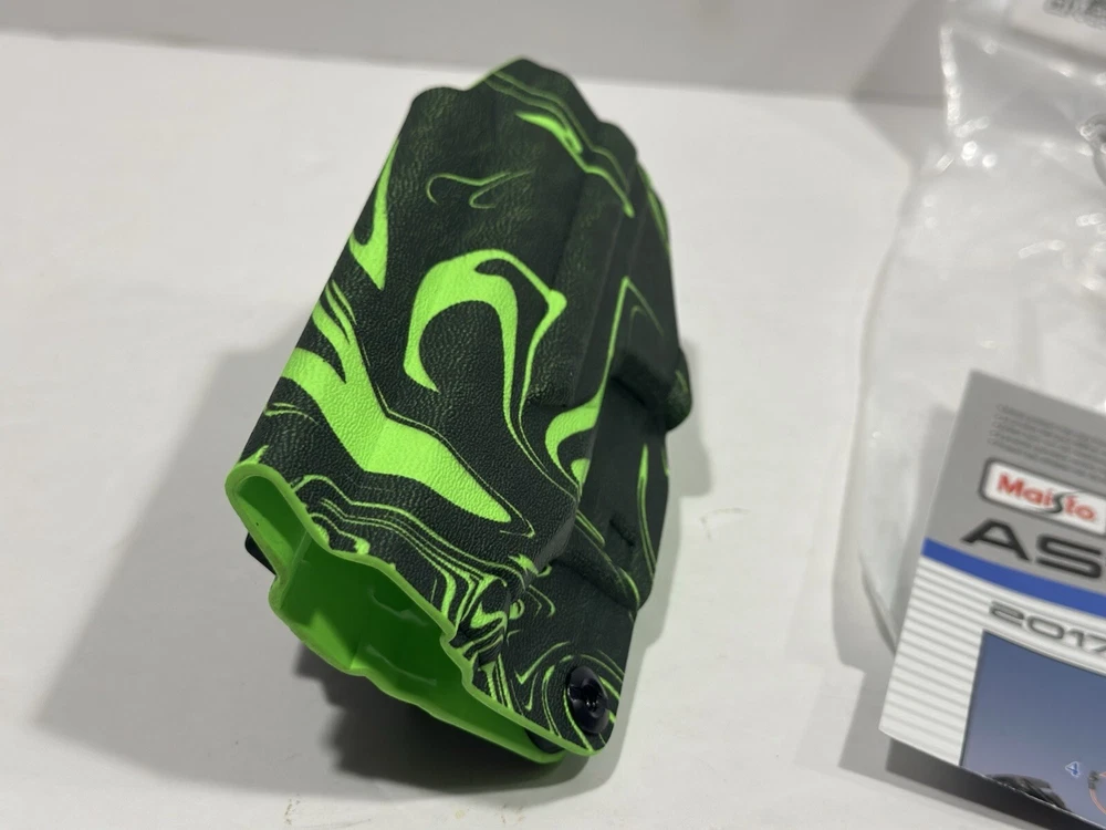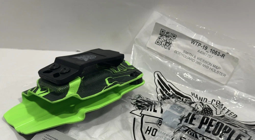 SMITH & WESSON M&P BODYGUARD 380 IWB HOLSTER - Color /Green Ink Swirl This Smith & Wesson M&P Bodyguard 380 holster is a durable, dependable, and form-fitting piece, offering effective concealment and quick, reliable access. Makes it easier to draw and re-holster the gun while keeping your eye on the possible threat or target instead of precious seconds spent searching for the holster. It will also make accidentally re-holstering your gun along with part of your shirt less of an issue Made in the USA Lifetime guarantee Inside the waistband (holster only) Fits a 1.5 inch belt