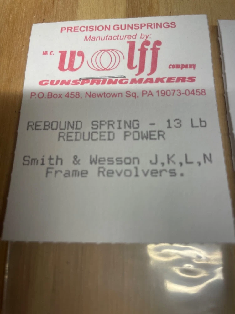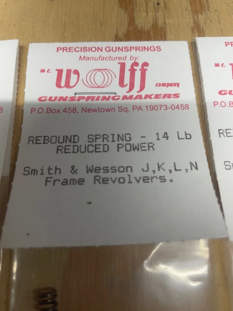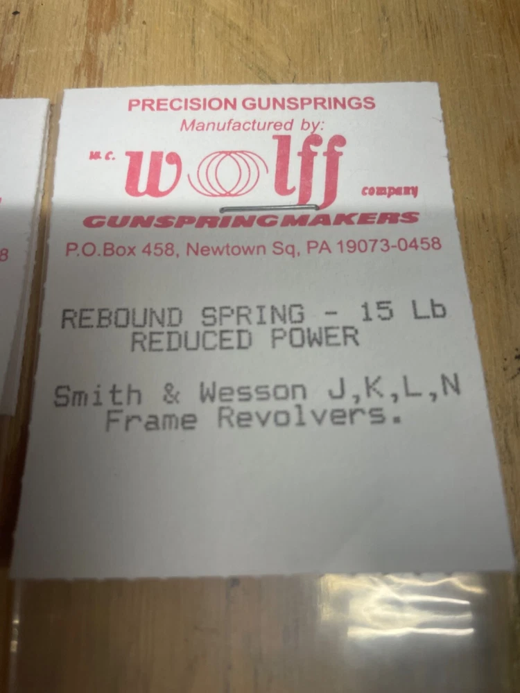 SMITH & WESSON REVOLVER K/L/N FRAME REBOUND SPRINGS BY WOLFF SPRINGS New in package - 3 springs. 13# 14# 15#