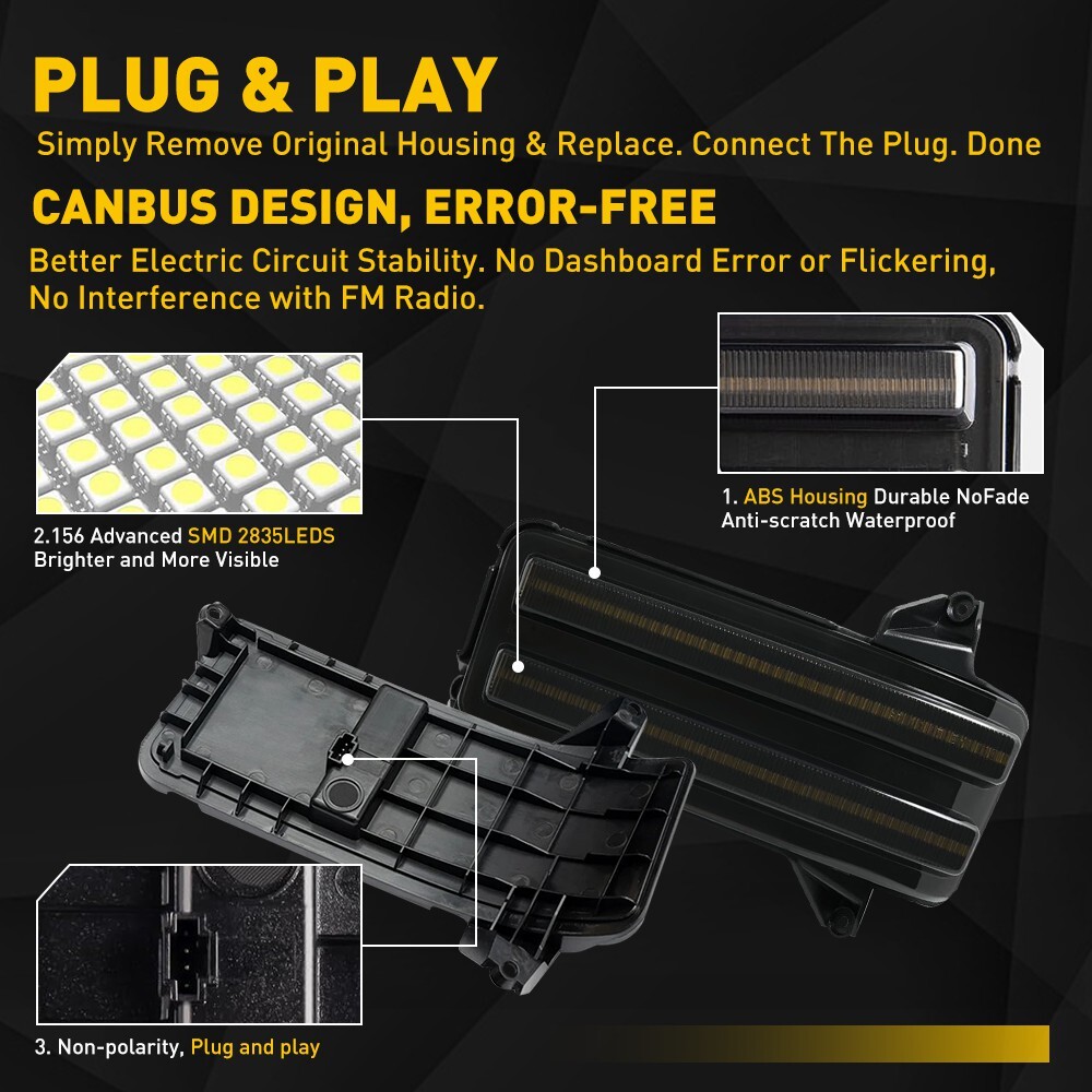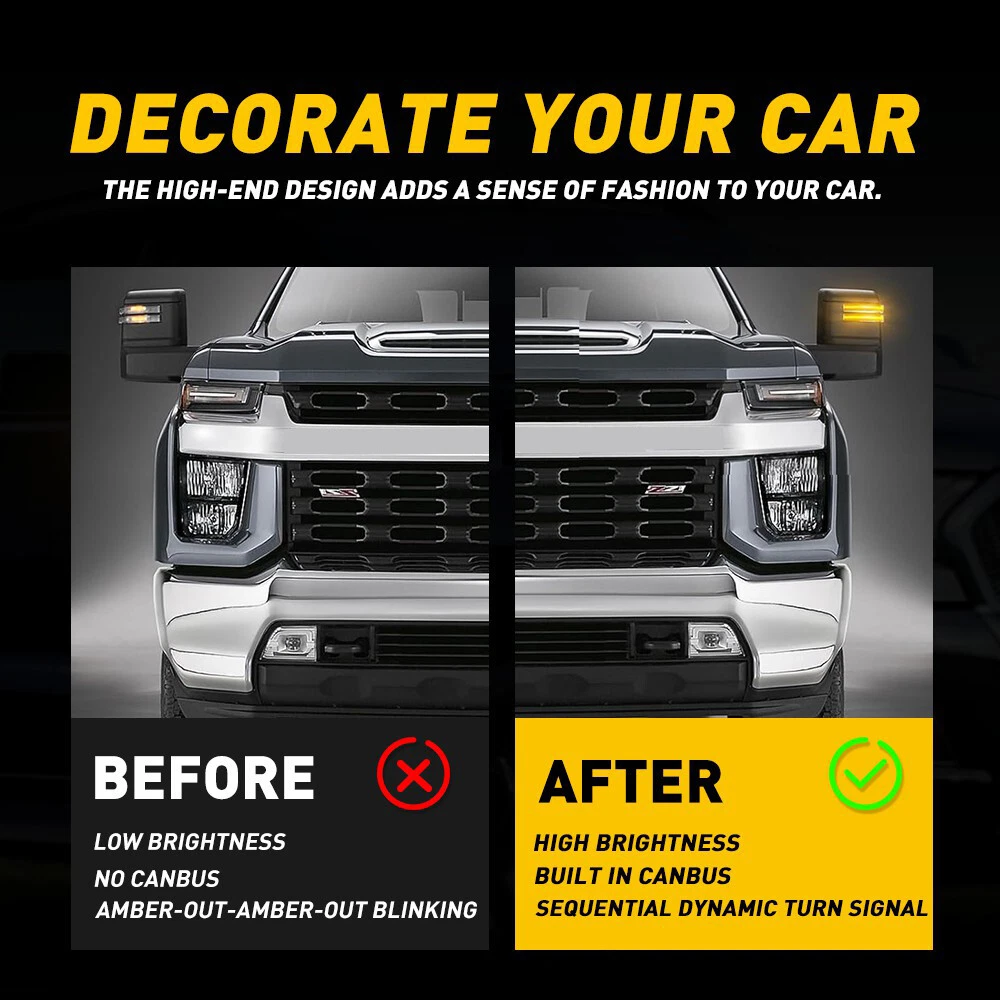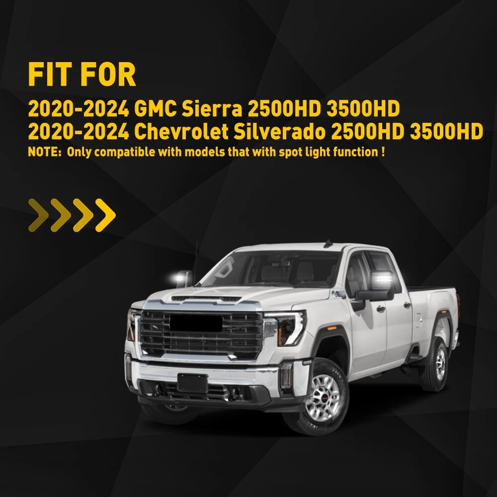 Upgraded my truck with these smoked LED mirror lights and they look sharp! The dynamic amber turn signals are super bright and add a modern touch. Installation was straightforward since my Silverado already had the spotlight function. The smoked lens gives a sleek, OEM+ look, and the build quality feels solid—no cheap plastic here. Love that they’re waterproof and built to last. Perfect fit for my 2022 model, no gaps or alignment issues. Definitely recommend if you want better visibility and a more aggressive style!