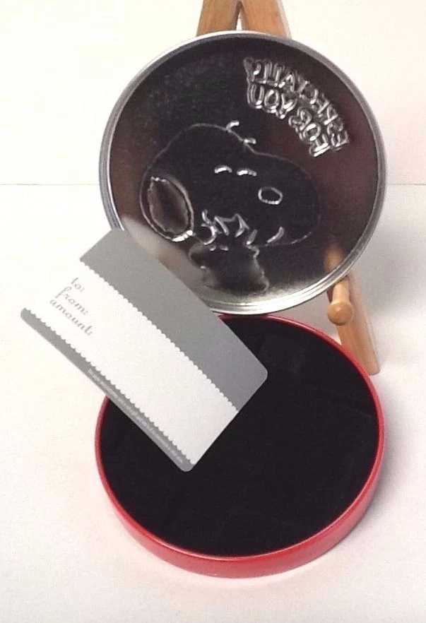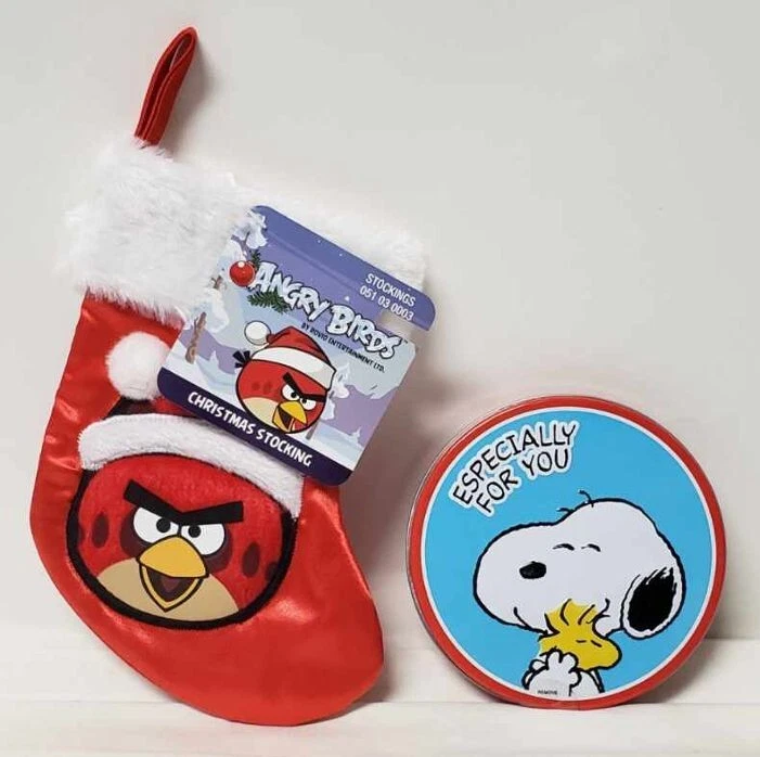 New/IMPERFECT Peanuts SNOOPY/Woodstock "Especially For You" Gift Card HOLDER Metal/Tin Box, 4.25" Diameter (small dings on the back) - collectible can, UPC 8 45445 00767 8 - Wooden d isplay stand not included. . ____________________________________ Angry Birds MINI Christmas STOCKING, 6.5" , Red Satin / White Faux Fur, NEW w/Tag - UPC 0 86131 18074 3 - Angry Bird in Santa hat - approx. 6.5” Height - Red Satin / White Faux Fur - Age 14+, NOT A TOY, Decorative ____________________________________ - pet-free / smoke-free environment - clean recycled packing materials often used Thanks so much for looking!