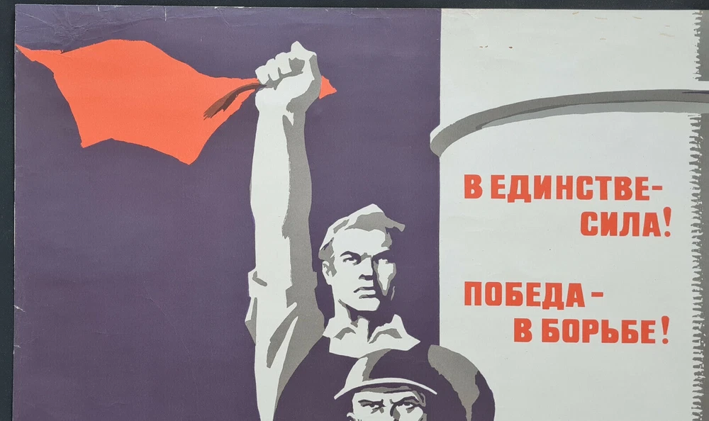 Original slogan on the poster: В ЕДИНСТВЕ - СИЛА! ПОБЕДА - В БОРЬБЕ! Literally English translation: IN THE UNITY IS POWER! THE VICTORY IS IN THE STRUGGLE! POSTER ARTIST: BRISKIN VENIAMIN MARKOVICH PRINT YEAR: 1976 SUBJECT: SOCIALISM, INTERNATIONALISM LANGUAGE: RUSSIAN PRINT RUN: 35.000 PUBLISHED BY: "PLAKAT", MOSCOW SIZE: IN: 25 ½ x 38 ⅝ = CM: 65 x 98 CONDITION: ROLLED, FAIR The poster has tears creases, folds, partially repaired by tape on the reverse, after further professional restoration will look incredible alive. The artwork is designed by highly famous Soviet poster artist Briskin Veniamin Markovich, it was issued in a limited editions. www.facebook.com/sovietartposters Listing and template services provided by inkFrog