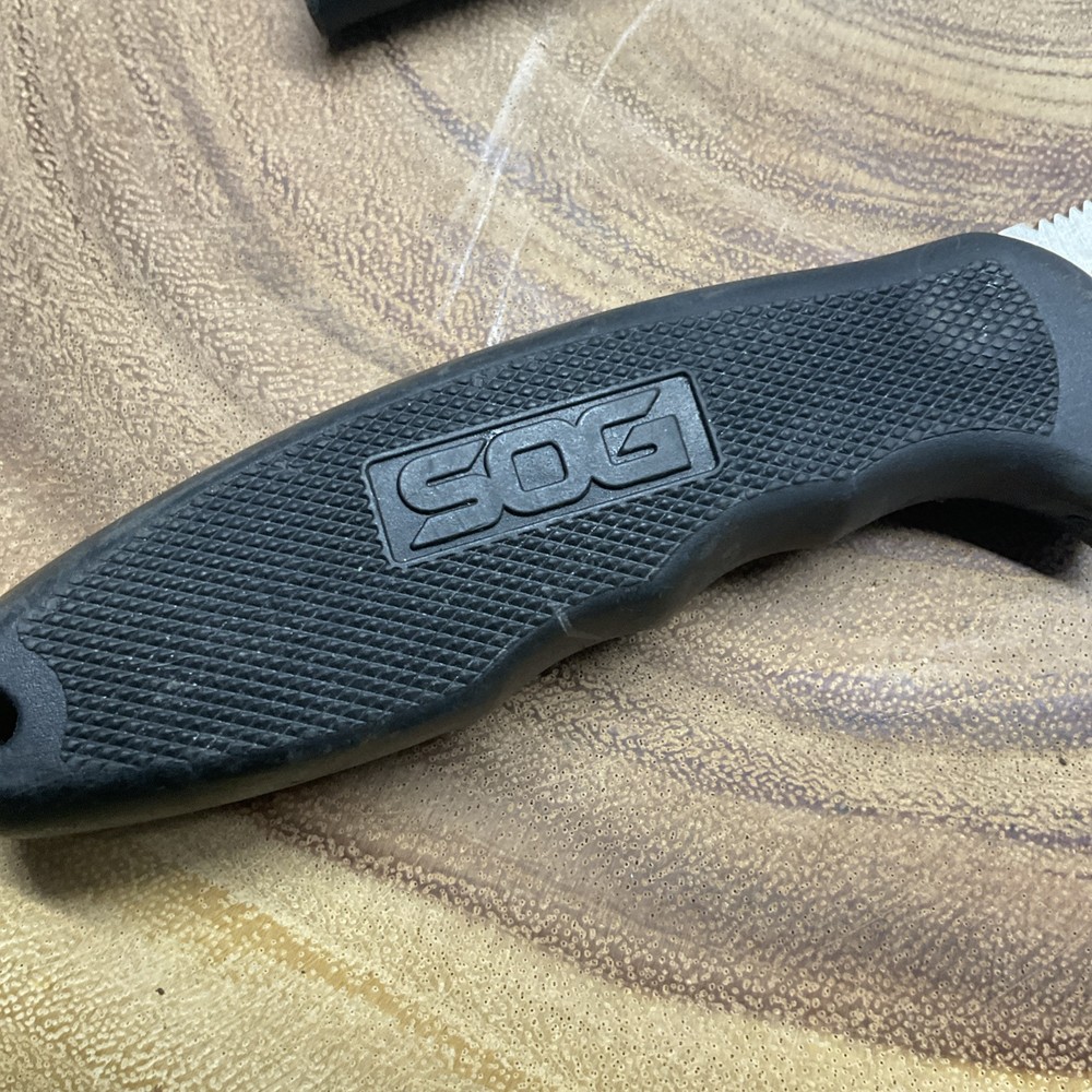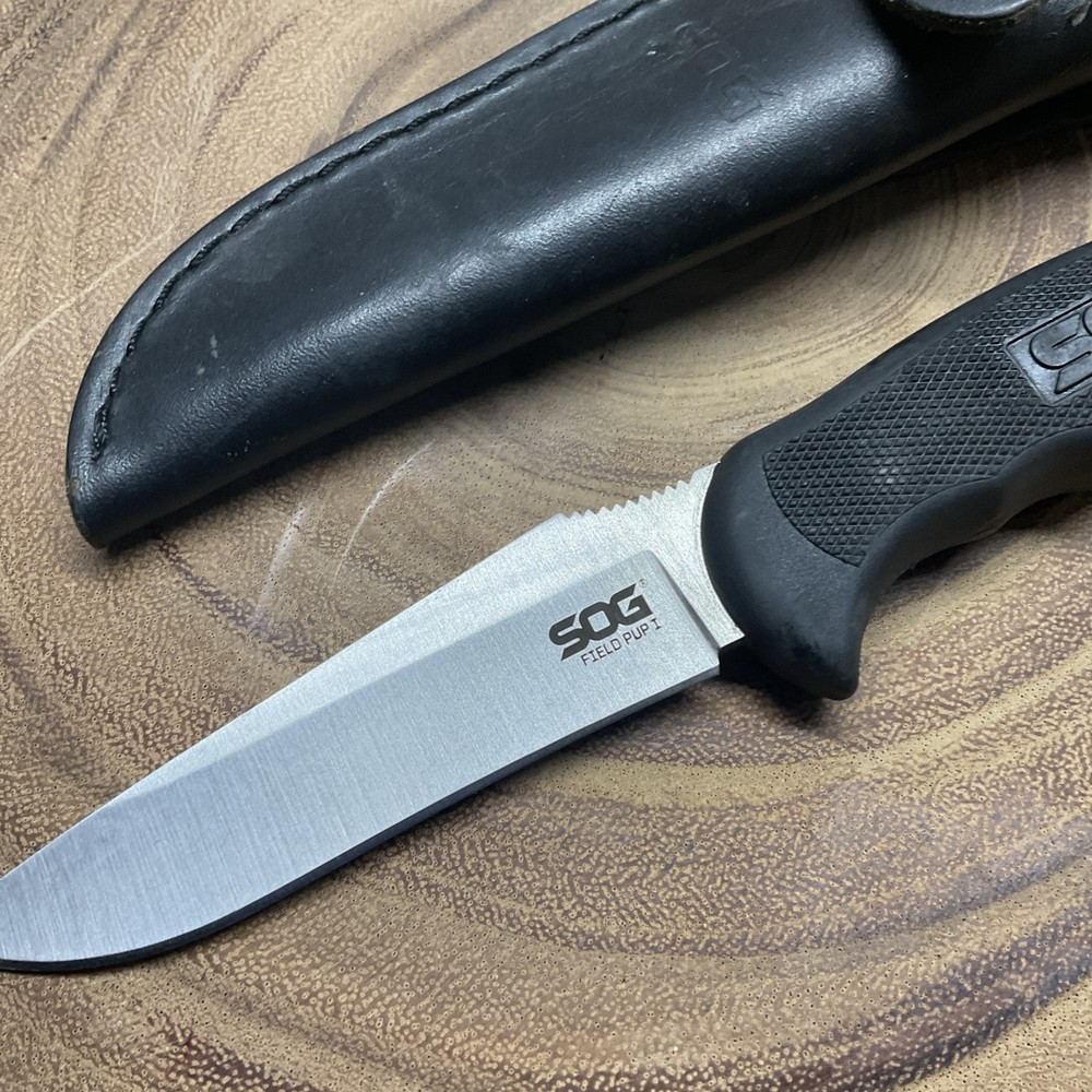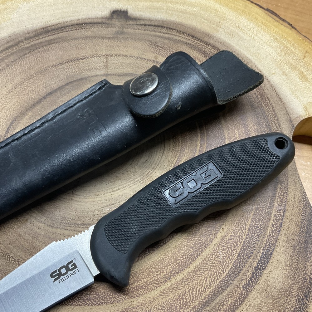 The SOG Field Pup I Fixed Blade Knife is a hunting knife with a 4" AUS-8 stainless steel blade that has a drop point and a plain edge. It features a full tang construction for durability and ambidextrous use, making it suitable for various users. The handle is made of Kraton-Black material for a comfortable grip, and it includes a lanyard hole and sheath for convenient carrying. This original 2003 model from SOG is a reliable and practical tool for outdoor activities.