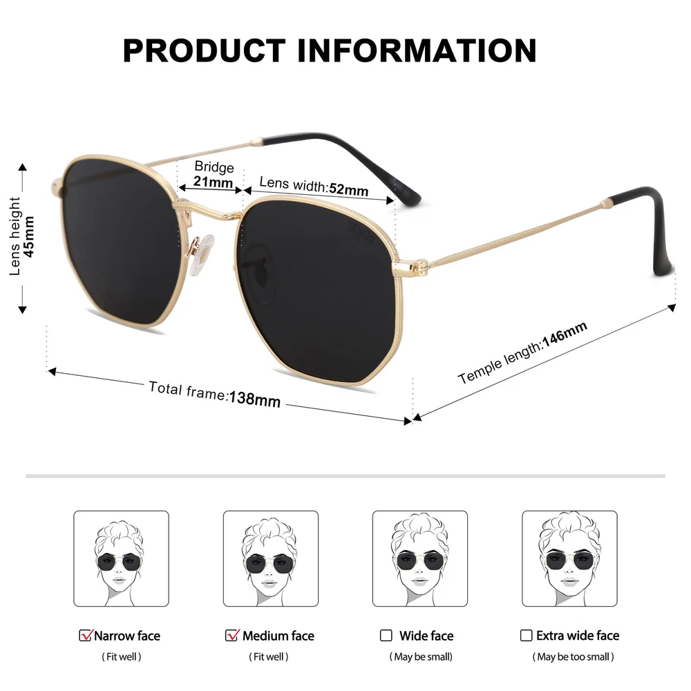 SOJOS Small Square Polarized Sunglasses for Men and Women Polygon Mirrored Lens Features: HIGH-DEFINITION UV400 TAC POLARIZED LENSES – SojoS's HD TAC polarized lenses can filter out sunlight reflected glare, and protect your eyes from long-term damage by blocking 99.99% of harmful UVA and UVB rays. ULTRA-LIGHT AND ULTRA-THIN FRAMES – These SojoS retro square hexagonal sunglasses are made of ultra-thin metal materials, so the frames are super light but very strong. These weights are only 40 grams(0.09 pounds), so you will feel very comfortable and no pressure on your nose. PERFECT ALL ROUNDER – These SojoS sunglasses are the perfect choice for outdoor sports and activities such as taking selfies, shopping, driving, traveling, and are suitable as a high fashion accessory and daily wear all year round. PRODUCT DIMENSION – Lens Width: 52mm(2.05inches) | Lens Height: 45mm(1.77inches) | Temple Length: 146mm(5.75inches) | Nose Bridge: 21mm(0.83inches). GIFT IDEAS PACKAGE – Sunglasses*1, microfiber pouch*1, microfiber glasses cleaning cloth*1, glasses box*1. It is also a gift packaged ready, making it a wonderful yet practical gift idea for friends and family! Features: HIGH-DEFINITION UV400 TAC POLARIZED LENSES – SojoS's HD TAC polarized lenses can filter out sunlight reflected glare, and protect your eyes from long-term damage by blocking 99.99% of harmful UVA and UVB rays. ULTRA-LIGHT AND ULTRA-THIN FRAMES – These SojoS retro square hexagonal sunglasses are made of ultra-thin metal materials, so the frames are super light but very strong. These weights are only 40 grams(0.09 pounds), so you will feel very comfortable and no pressure on your nose. PERFECT ALL ROUNDER – These SojoS sunglasses are the perfect choice for outdoor sports and activities such as taking selfies, shopping, driving, traveling, and are suitable as a high fashion accessory and daily wear all year round. PRODUCT DIMENSION – Lens Width: 52mm(2.05inches) | Lens Height: 45mm(1.77inches) | Temple Length: 146mm(5.75inches) | Nose Bridge: 21mm(0.83inches). GIFT IDEAS PACKAGE – Sunglasses*1, microfiber pouch*1, microfiber glasses cleaning cloth*1, glasses box*1. It is also a gift packaged ready, making it a wonderful yet practical gift idea for friends and family! eBay integration by