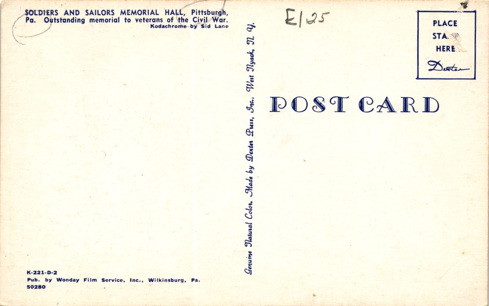 MAKE AN OFFER. THE MORE YOU BUY THE BETTER DEAL I WILL ACCEPT The front of the postcard features a photograph of the Soldiers and Sailors Memorial Hall in Pittsburgh, Pennsylvania. This memorial is dedicated to the veterans of the Civil War. The image was taken by Sid Lane using Kodachrome technology. The postcard was published by Wonday Film Service, Inc. in Wilkinsburg, Pennsylvania.