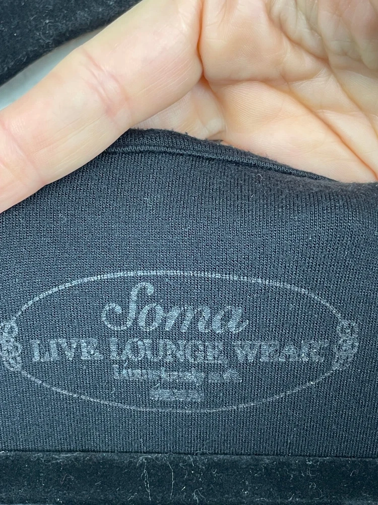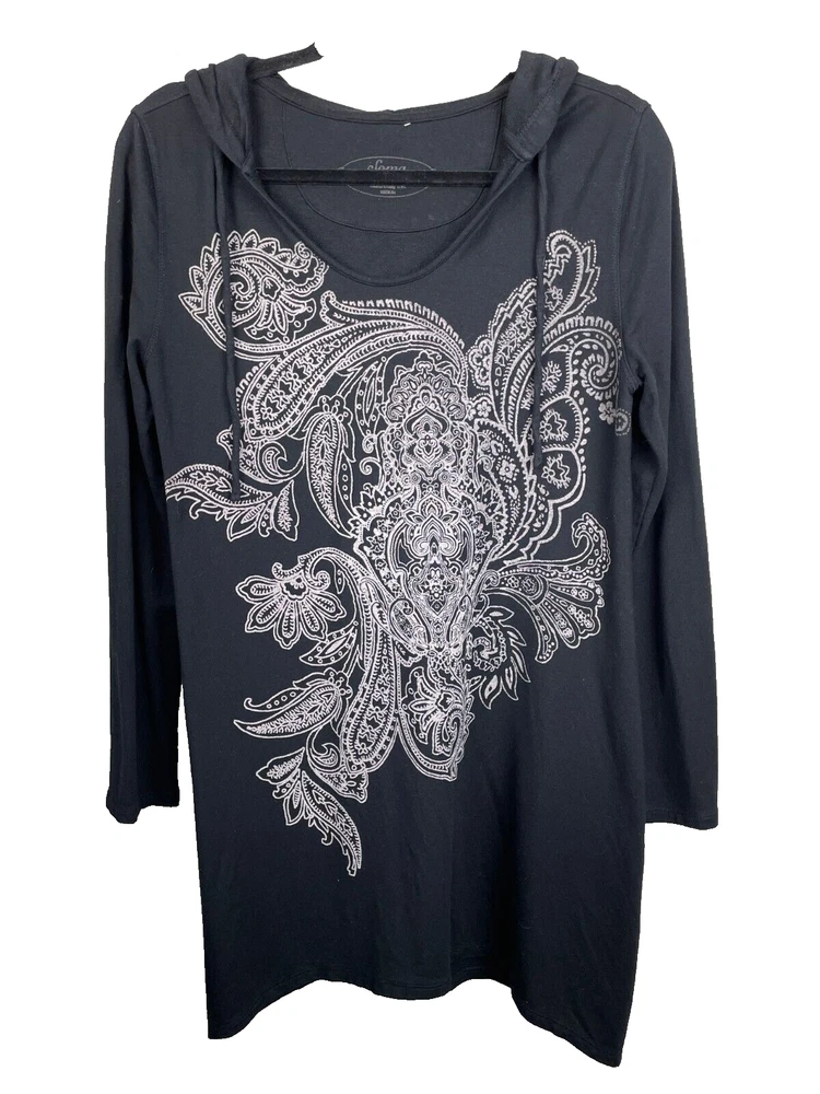 Size: M Features: Hooded Garment Care: Machine Washable Brand: Soma Style: Loungewear Department: Women Color: Black Size Type: Regular Season: Fall, Spring, Summer, Winter Closure: Pullover Material: Modal, Spandex Sleeve Length: Long Sleeve Pattern: Floral Dress Length: Short Occasion: Casual, Travel Country/Region of Manufacture: Vietnam Theme: Flower, goth, loungewear, witchy