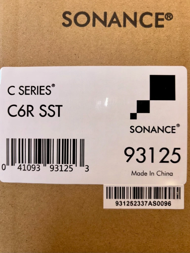 C6R SST 93125 SONANCE 6-1/2" DUAL VOICE COIL, 2-WAY IN-CEILING STEREO SPEAKER WITH TWO 1" TWEETERS. DESCRIPTION C Series C Series extends the Sonance distributed audio line with a combination of value, aesthetics, and performance. Tweeter: Two 1" (25mm) cloth dome, Ferrofluid-cooled Woofer: 6 1/2" (165mm) Polypropylene cone with a rubber surround, dual voice coil Frequency Response: 50Hz - 20kHz ±3dB Impedance: 8 ohms nominal; 6 ohms minimum Power Handling: 5 watts minimum; 85 watts maximum Sensitivity: 88dB SPL (2.8V/1 meter) Shipping Weight: 5.2 lbs (2.4kg) each Dimensions: 9" (232mm) x 3 3/4" (95mm) Cut-Out Dimensions: 8 1/4" (210mm) Speaker Depth: 3 3/4" (95mm) Grille: Perforated steel grille