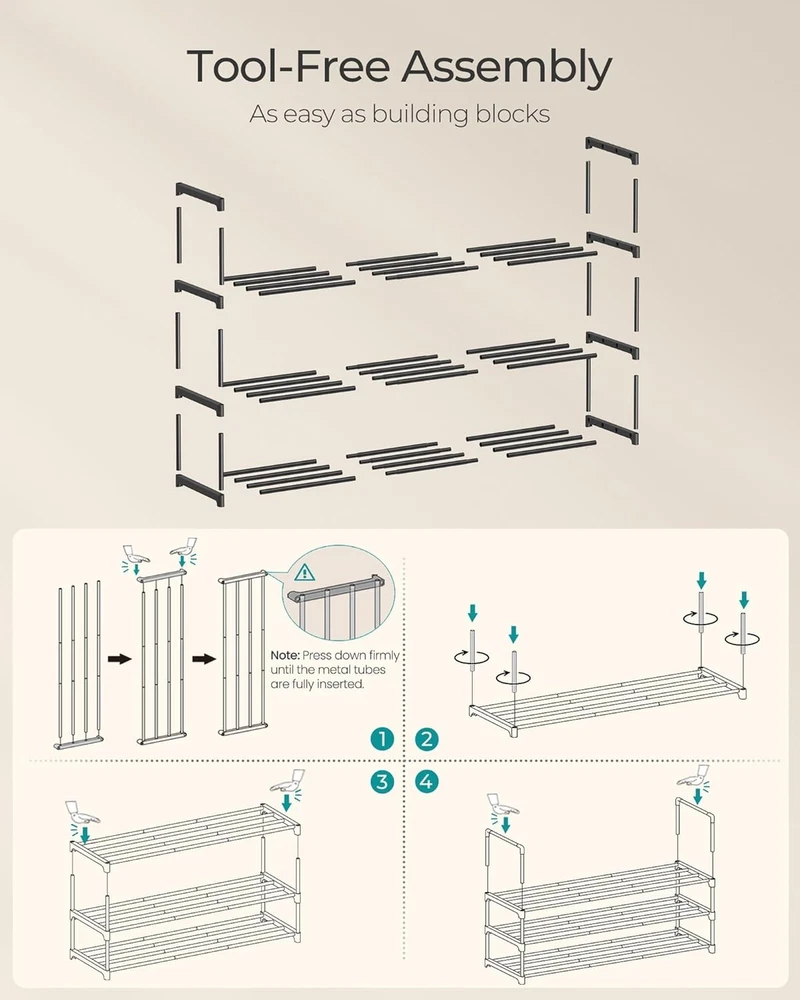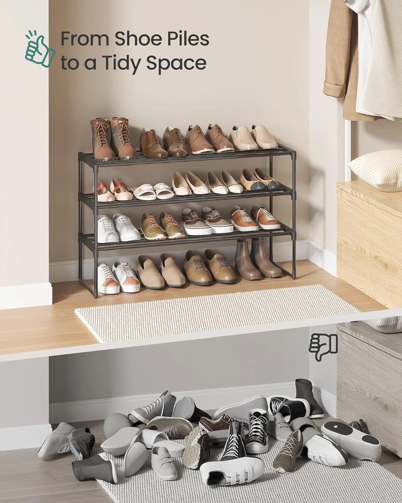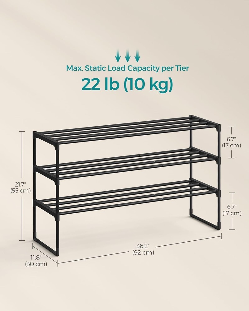 Free eBay listing template designed by dewiso.com SONGMICS Shoe Rack, 3-Tier Shoe Organizer, Metal Storage Shelf, Upright or Upside Down, for 16-20 Pairs, Stackable, for Entryway, 11.8 x 36.2 x 21.7 Inches, Black ULSA303B02 FREE AND FAST SHIPPING! About this item 【FLEXIBLE & VERSATILE】The shelf can be used flexibly—stand it upright; flip it over to gain additional storage space under the shelf; stack 2 shelves on top of each other to make use of vertical space 【SPACIOUS】The shelf measures 11.8"D x 36.2"W x 21.7"H. When used upside down, it can accommodate up to 16 pairs of men's shoes or 20 pairs of women's shoes. With the optimal spacing between the levels, the shelf can also hold ankle boots 【ROBUST AND DURABLE】Connected by quality plastic connectors, this shoe organizer made of thick metal tubes holds up to 22 lb per tier, giving your footwear a reliable home 【EASY ASSEMBLY】A simple structure, numbered parts, and illustrated instructions make this shoe shelf easy to assemble. Even better, no tools are needed! 【EASY TO CLEAN】With a smooth coating, this shoe storage organizer is easy to wipe clean with a soft damp cloth, saving you time and energy Product We offer a 30-Day Return Policy on items which you are not completely satisfied with. You have the option for a full-refund or an exchange of the item. No returns are available on items shipped outside of the US . Shipping We offer Free Shipping to the US and ship within 2 business days of payment, usually sooner. We use UPS express shipping. That's why your products are usually delivered within 3 days . Contact We try our very best to make sure every customer is completely satisfied. If there's a problem , message us! We're happy to help. 24/7 live chat available.