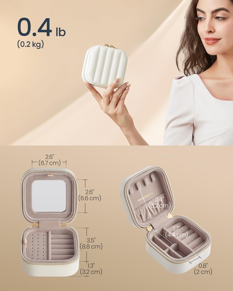 SONGMICS HOME Travel Jewelry Case, Small Jewelry Box Organizer with Mirror, 4.1 x 4.1 x 2.4 Inches, PU Surface with Stitching, Portable, Cloud White, ANAH Collection UJBC179W01 - Buy Now with Fast Shipping! SONGMICS HOME Travel Jewelry Case, Small Jewelry Box Organizer with Mirror, 4.1 x 4.1 x 2.4 Inches, PU Surface with Stitching, Portable, Cloud White, ANAH Collection UJBC179W01 Product Details Color: Cloud White Brand: SONGMICS HOME Material: PU (Polyurethane) Leather, MDF (Medium Density Fiberboard), Velvet, Metal, Glass Style: Modern Special Feature: Portable Recommended Uses For Product: Necklace, Bracelet, Ring, Watch, Earring, Bangle Product Dimensions: 4.13"D x 4.13"W x 2.36"H Target Audience: Women Shape: Rectangular Finish Type: PU (Polyurethane) Leather Color: Cloud White Brand: SONGMICS HOME Material: PU (Polyurethane) Leather, MDF (Medium Density Fiberboard), Velvet, Metal, Glass Style: Modern Special Feature: Portable Recommended Uses For Product: Necklace, Bracelet, Ring, Watch, Earring, Bangle Product Dimensions: 4.13"D x 4.13"W x 2.36"H Target Audience: Women Shape: Rectangular Finish Type: PU (Polyurethane) Leather Inner Material: Velvet Item Weight: 0.2 Kilograms Number of Compartments: 4 Jewelry Storage Type: Jewelry Box Number of Items: 1 UPC: 194343089720 Manufacturer: SONGMICS HOME Occasion: New Home, Anniversary, Birthday Closure Type: Zipper Part Number: UJBC179W01 Item Weight: 7 ounces Country of Origin: China Size: 4.1"W Finish: PU (Polyurethane) Leather Number Of Pieces: 1 Special Features: Portable Included Components: 1 x Travel Jewelry Box Batteries Included?: No Batteries Required?: No Date First Available: August 5, 2024 Key Features ✅ STYLE REDEFINEDThe SONGMICS HOME ANAH Collectionyour ultimate jewelry storage solutionfeatures a sleek, soft PU surface with intricate quilted stitching and unique pyramid-styled hardware, elevating your pieces and making a one-of-a-kind statement ✅ COMPACT AND TRAVEL-READYTravel in style with our portable jewelry box, a compact 4.1"D x 4.1"W x 2.4"H size that effortlessly fits into your bag or suitcase. Complete with an independent mirror for quick makeup checks and smooth zippers for easy access ✅ SECTIONAL STORAGEWith adjustable dividers, ring slots, a dedicated necklace section, and a removable earring board, this small jewelry case ensures everything arrives as nicely as you packed itno tangles, knots, or scuffs, even during long journeys ✅ ALL-AROUND PROTECTIONDesigned with a sturdy MDF frame and a water- and wear-resistant surface, this jewelry case maintains its shape even when compressed in luggage. Lined with soft velvet, it protects your jewelry from scratches ✅ GIFT OF ELEGANCEDelight your loved ones with this exquisite travel jewelry boxa true symbol of refined taste. Perfect for keeping their jewelry safe while on the go. And why not spoil yourself with a touch of luxury as well? Product Description
