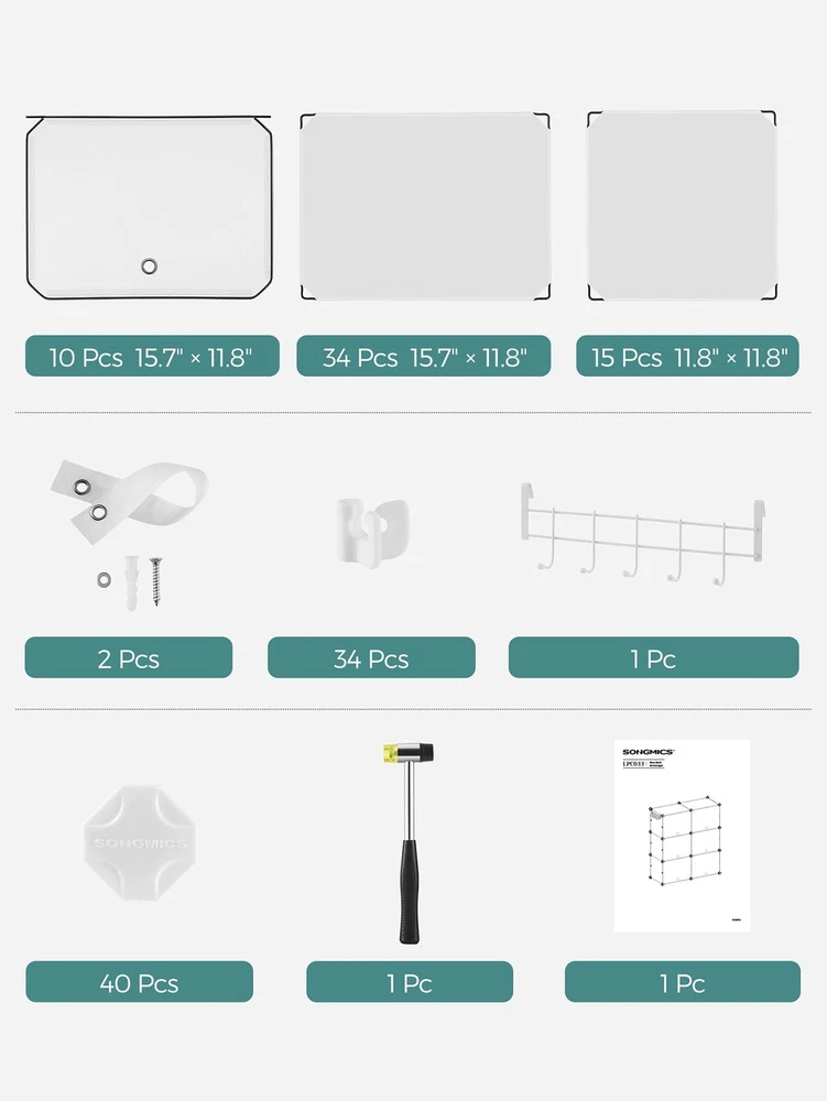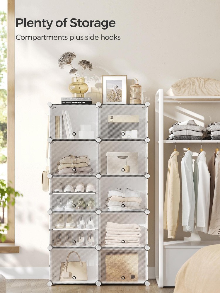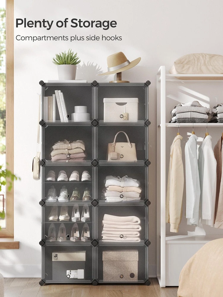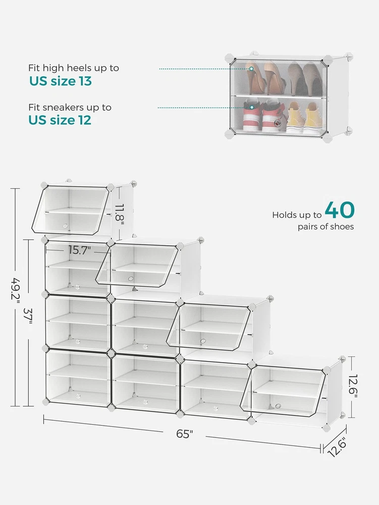 About this item [Storage Aplenty] This versatile plastic shoe storage organizer, able to accommodate up to 40 pairs of shoes, doubles as storage for bags and clothing. Its space-efficient side hooks offer a handy spot to hang hats or dog leashes [Robust and Secure] Crafted with premium connectors, durable plastic panels, and strong steel wire, each slot of this shoe storage cabinet holds up to 11 lb. The provided anti-tip kit ensures safe use in living rooms or bedrooms [Easy Assembly and Disassembly] The included rubber mallet makes assembling this shoe rack quick and easy. This organizer can also be quickly disassembled to store or transport, letting you easily rearrange this around your home [Adaptable and Versatile] Configure this storage unit in different ways. Make it have 2 or 3 separate rows, or even divide it into 2 small shelf units to organize shoes, clothes, or toiletries in your entryway, bathroom, or any other desired space [Ventilated and Easy to Clean] This plastic shoe cabinet features clear doors, providing dust-proof and waterproof protection while allowing easy viewing of shoes inside. Grommets on the doors enable effortless opening and promote ventilation Specifications: Material: ABS Plastic Connector, PP Plastic Panel, Steel Frame Product Size: 12.6"D x 32.7"W x 61.4"H (32 x 83.1 x 156 cm) Interior Size of Each Compartment: 11.8"D x 15.7"W x 11.8"H (30 x 40 x 30 cm) Product Weight: 21.2 lb (9.6 kg) Max. Static Load Capacity per Compartment: 11 lb (5 kg) Total Max. Static Load Capacity: 110 lb (50 kg) Package Contents: 10 x Plastic Panel with Grommet (15.7" x 11.8") 34 x Plastic Panel (15.7" x 11.8") 15 x Plastic Panel (11.8" x 11.8") 2 x Anti-Tip Device 34 x Joint 40 x Plastic Connector 1 x Wire Panel with 5 Hooks 1 x Rubber Mallet 1 x Instructions SONGMICS Notes: For safety, be sure to secure the shoe rack to the wall with the included anti-tip kit. Children are not allowed to climb on or play with the shoe storage cabinet for safety. Do not overload this shoe storage organizer. Do not place the storage unit outdoors for a long time to avoid weathering. Keep the rounded sides of the plastic connectors marked "SONGMICS" facing outwards during assembly. During assembly, ensure that the corners of the panels are fully inserted into the bottom of the connectors for greater stability. Material: Stainless Steel