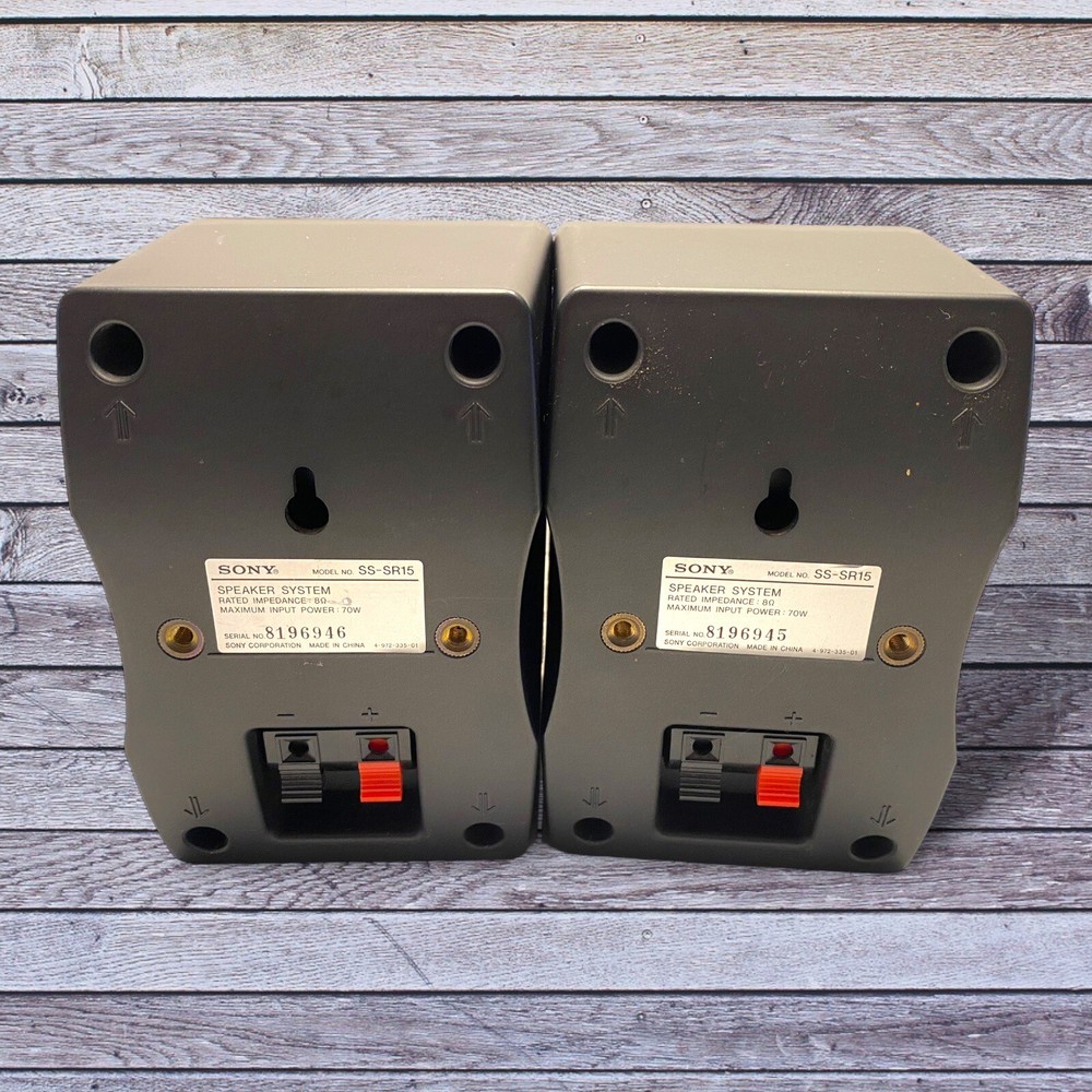SONY Surround Sound Speaker System - SS-SR15 Pair 8 Ohm 70 Watt preowned condition - clean Please review all pictures and ask anY questions before bidding Please review all pictures; they are part of the description. If you need additional pictures or information, please asked. All Items have been cleaned and sanitized. Please don’t hesitate to ask any questions or make an offer. Thank you for looking and Have a Great Day! “QUALITY MESSAGE: Your satisfaction is our #1 priority. All our products are in good condition, but as most of our products are preowned, they show normal signs of use or are in like new condition. We do look over each item and will describe anything that is out of the ordinary- but we have and may inevitably over-look things. If you have received your item(s) and find that there is missing information such as a defect, please contact us prior to leaving a negative or neutral feedback and we'll be sure to offer a speedy resolution to any issues that may arise.