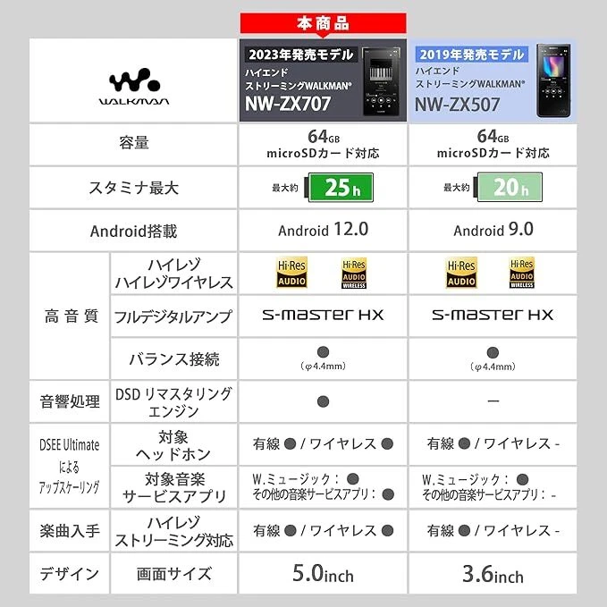 " SONY WALKMAN NW-ZX707 64GB ZX Series Hi-Res Audio Player English Available Description high-end streaming WALKMAN that inherits the technology of the flagship model and has further evolved. We have generously applied the flagship high-quality technology that we have cultivated to date, achieving high-quality sound that goes beyond the conventional ZX. The aluminum cutting casing and internal oxygen-free copper cutting block are used to achieve an extended sense of transparency and a clear and powerful low frequency range. In order to further strengthen the power supply, we have adopted the same FTCAP3 as the WM1M2 in the power supply section of the audio block, and a large-capacity, low-ESR solid polymer capacitor for the main power supply. Improved expressive power, wider sound field, and improved sound transparency, resulting in clear and powerful bass.Furthermore, by using high-quality solder with added gold in the manual soldering and reflow soldering parts, we have increased the ability to reproduce minute sounds and improved the sense of spaciousness and localization. The large coil uses parts of the same size as WM1M2. Improves sound resolution. We strive for a sense of realism and presence, as if you were listening to a live performance right in front of your eyes. High-performance full digital amplifier compatible with high-resolution playback Supports DSD native playback (up to 11.2MHz) and linear PCM playback (up to 384kHz/32bit). In addition, the maximum practical output is 50mW + 50mW (16Ω) when unbalanced and 230mW + 230mW (16Ω) when balanced. Achieving high sound quality that maintains detail from low volumes to high volumes, realistically reproducing the powerful bass energy and speed, as well as the delicate atmosphere. You can experience it with a thrilling sense of reality. * Valid only when playing W. Music with a wired connection. It is invalid when playing other than W.Music or when wireless listening (when connected to Bluetooth(R)). DSD native playback is only supported when connected to a balanced connection. When connected unbalanced, the playback will be converted to linear PCM. ""DSEE Ultimate"" is even closer to high-resolution sound sources using AI technology Using AI (artificial intelligence) technology that learns from a huge amount of music data, it analyzes the music scene in real time and optimally upscales it to high-resolution (*) high-quality sound. Expand the bits and increase the sampling frequency to a maximum of 192kHz/32bit equivalent. Using AI technology, it automatically identifies songs and improves the reproduction of minute sounds. The evolution of AI algorithms has also improved the upscaling performance of CD-quality sound sources (44.1kHz and 48kHz/16bit). In addition to being connected via wire and using the W.Music app, it is also compatible when connecting wirelessly and using streaming services. You can enjoy any sound source with high-resolution (*) high quality sound that reproduces minute sounds. * When ""DSEE Ultimate"" is ON for both wired and wireless connections (up to 192kHz/32bit). When connected wirelessly (Bluetooth(R)) using the LDAC codec, playback is possible at up to 96kHz/24bit. Equipped with ""DSD Remastering Engine"" and ""DSEE Ultimate"" Equipped with a ""DSD remastering engine"" that converts all input PCM sound sources into 11.2MHz equivalent DSD signals. Sony's unique algorithm converts all PCM sound sources to 11.2MHz equivalent DSD signals without losing the amount of information in the original data (*). It can be turned on/off, so you can switch it according to your preference.* Valid only when playing W. Music with a wired connection. It is invalid when playing other than W.Music or when wireless listening (when connected to Bluetooth(R)). DSD native playback is only supported when connected to a balanced connection. When connected unbalanced, playback will be converted to linear PCM. * ""DSD Remastering Engine"" can be turned on/off on the main unit. USB Audio compatible Digital connection is possible with USB DAC amplifier etc. The asynchronous method achieves high sound quality by minimizing the jitter that occurs during USB transfer. In addition to PCM output, it is also possible to output DSD RAW. (PCM: max. 384kHz/32bit, DSD RAW: max. 11.2MHz/1bit) Supports balanced output that completely separates left and right sounds Balanced output completely separates left and right sounds, making it possible to output sound signals without going through the ground. It minimizes crosstalk (interference between left and right signals) that adversely affects stereo sound, and reproduces delicate sound with low distortion and little noise. Streaming service compatible You can install streaming services such as Amazon Music, Apple Music, LINE MUSIC, Spotify, YouTube Music, etc. according to your preference. We distribute a huge variety of songs regardless of genre, so you can enjoy discovering new music as well as your favorite songs. 5.0-inch touch panel LCD By tapping the volume display area at the top of the screen, a volume adjustment dialog will be displayed. The large dial operation UI allows you to quickly and intuitively adjust the volume in 120 steps. Improving battery life through power saving By adopting a new platform, we have achieved power savings. In particular, power consumption during standby and when using music streaming services is significantly reduced. Continuous playback is possible for up to 25 hours (*1) when using the music playback app ""W. Music"" and up to 22 hours (*2) when using the music streaming service app (offline mode).As a dedicated music device, we strive for battery performance that allows for comfortable and long music playback. *1 When playing continuously with ""W. Music"" in MP3 128kbps mode, wired connection, and screen off. Varies depending on setting conditions *2 When playing continuously in offline mode with a music service app other than ""W. Music"" in MP3 128kb