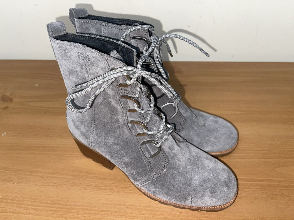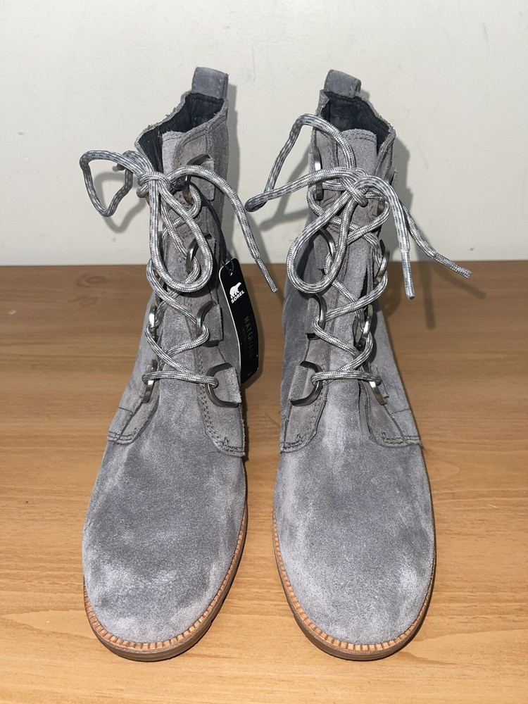 Elevate your shoe game with these stylish SOREL Women's Suede Cate Lace Booties. These waterproof leather boots in gray color are perfect for travel, casual outings, workwear, and business meetings. The round toe shape and low block heel style provide comfort and arch support, while the lace-up closure and eyelet logo accents add a touch of sophistication. Made with high-quality suede material and lined with canvas, these boots are both durable and stylish. The SOREL brand is known for its superior quality, making these boots a great investment for any wardrobe. Get ready to step out in style with these trendy booties! New without box. Shipped with USPS ground advantage.