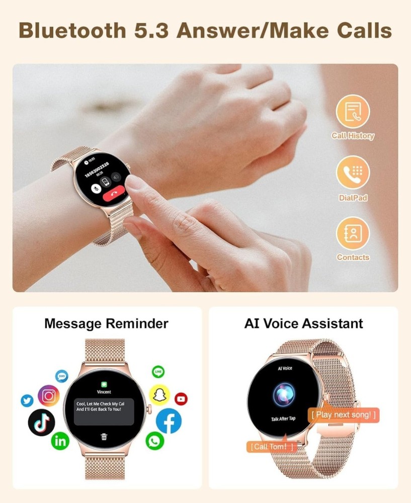 The Reloj Inteligente smart watch is a fashionable and functional accessory designed for women. With a sleek gold round case and matching gold plated band, this smart watch is both stylish and practical. It boasts a battery life of 10.0 days, ensuring that you can wear it for extended periods without worrying about charging. Compatible with both iOS and Android operating systems, it offers a range of special features including time display, sleep monitoring, email notifications, and calendaring. Perfect for staying connected and organized on the go, this smart watch is a must-have for tech-savvy women.