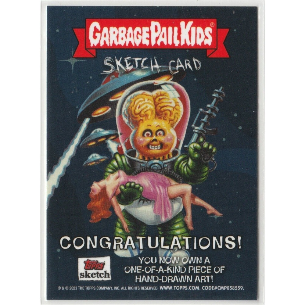 1/1 Sketch Card artist Mark Parini Topps Garbage Pail Kids GPK 2023 Intergoolactic Mayhem chase insert SP short print artist hand-drawn color sketch card hard signature autograph trading card Junkfood John / Ray Decay (Original Series 1)