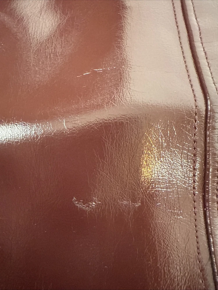 It have a small scratch in one of the legs in front please see the last pictures for this detail. Red bag