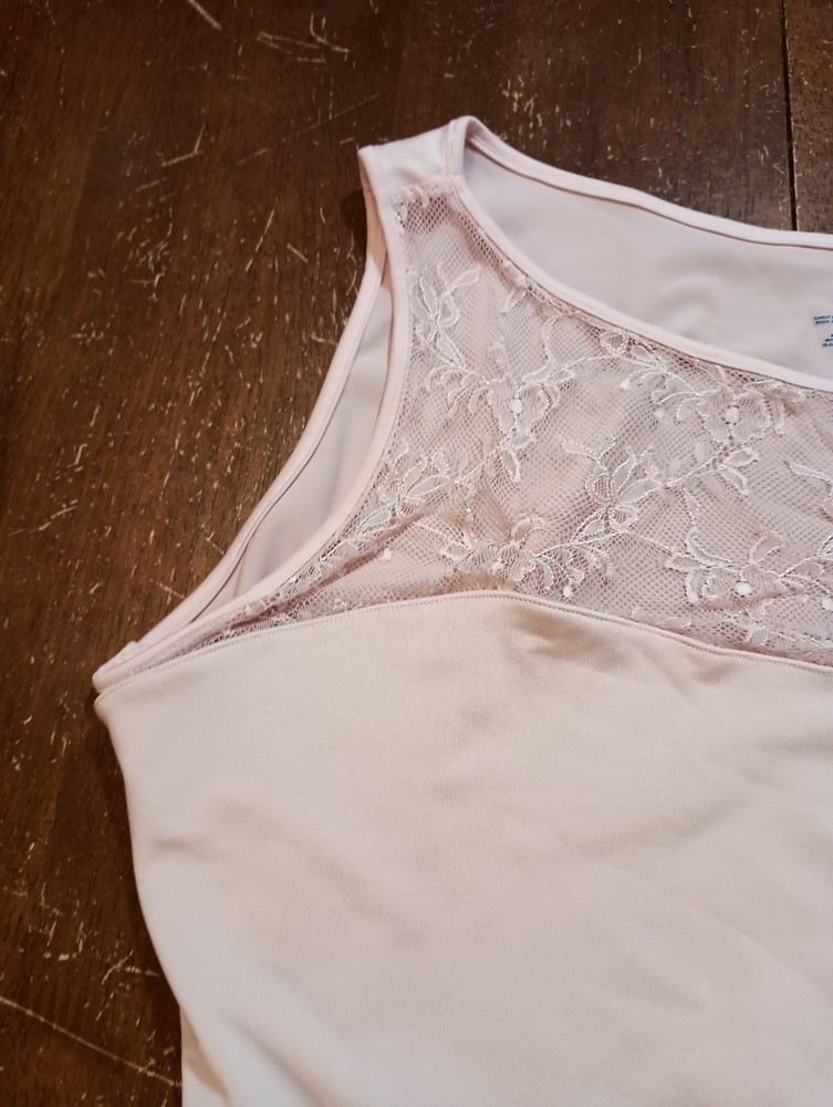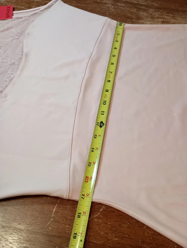 Color is Rosebud - a light pink Size says 2X - see photos for approximate measurements - Wear to smooth and firm tummy and waistline - Layer underneath a jacket or show it off - Gorgeous lace bateau neckline provides peek a boo Coverage - Under bust seam for added support This is currently being stored in a smoke/pet friendly home (will be put back in packaging until sold) Please see all photos before purchasing Check out my other listings as well!