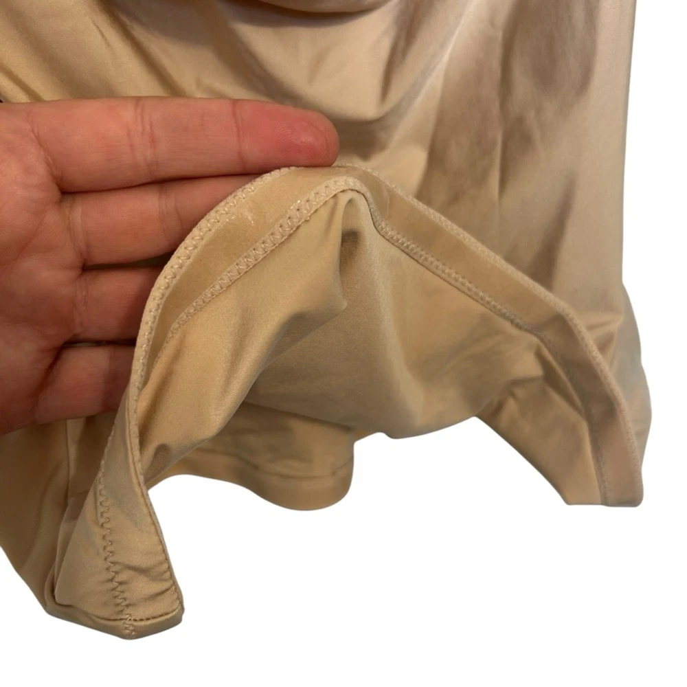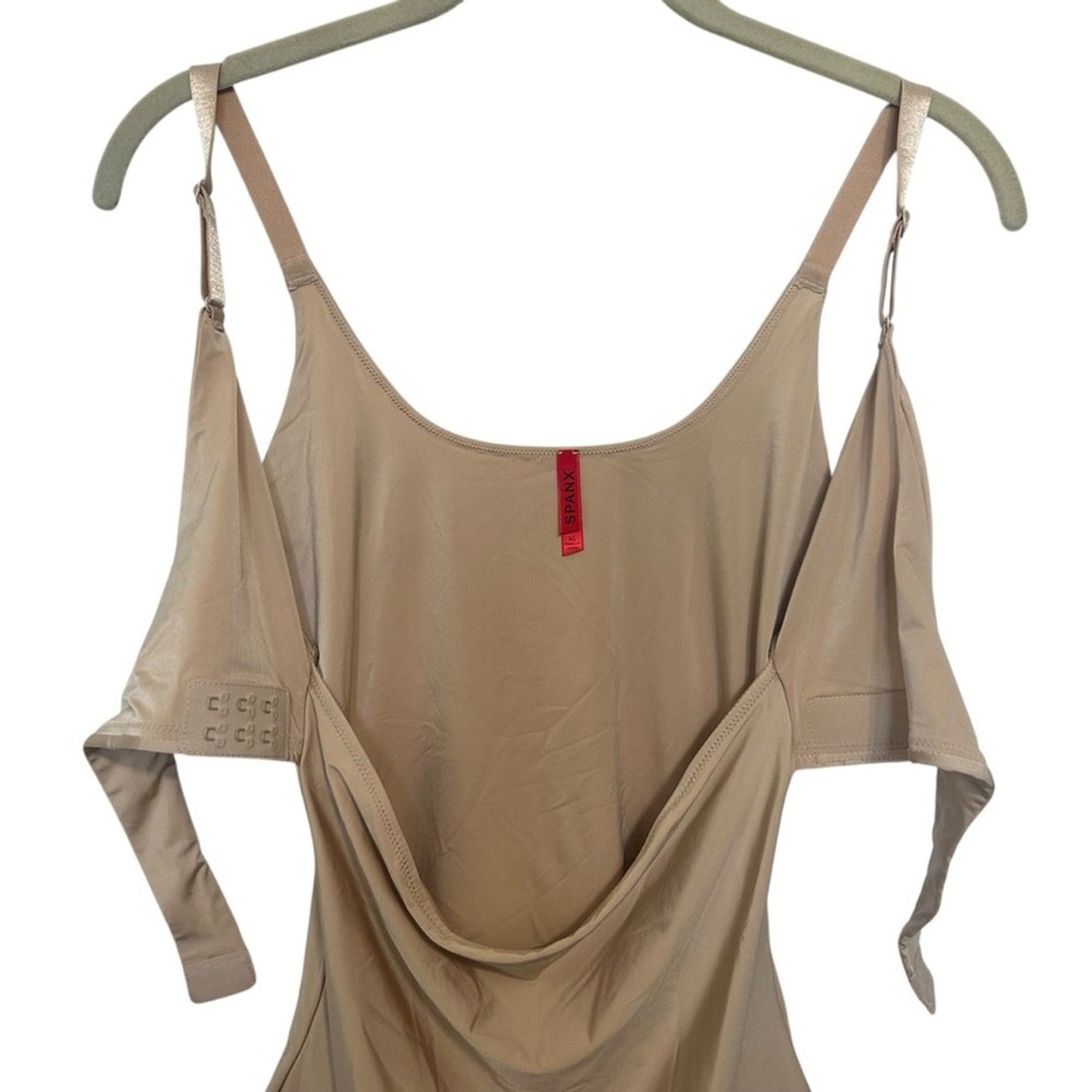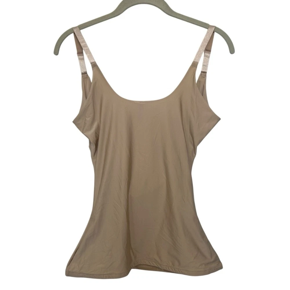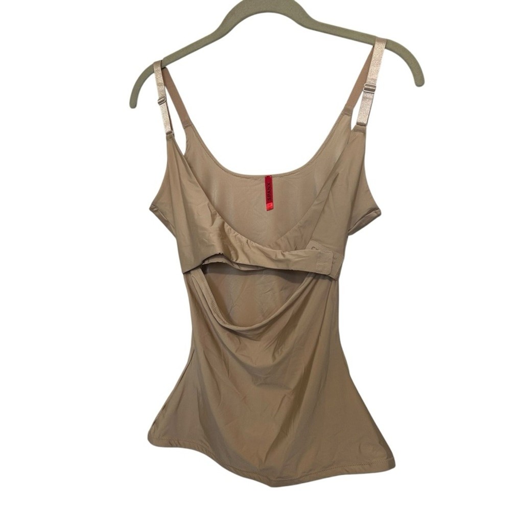 Women’s slimming tank, cami, shapewear SPANX Front crisscross adjustable closure Adjustable straps Tan, beige color Size XL Anti roll, clear rubber on underside of of hem SPANX material creates a slimming silhouette Excellent like new condition- bought but never wore