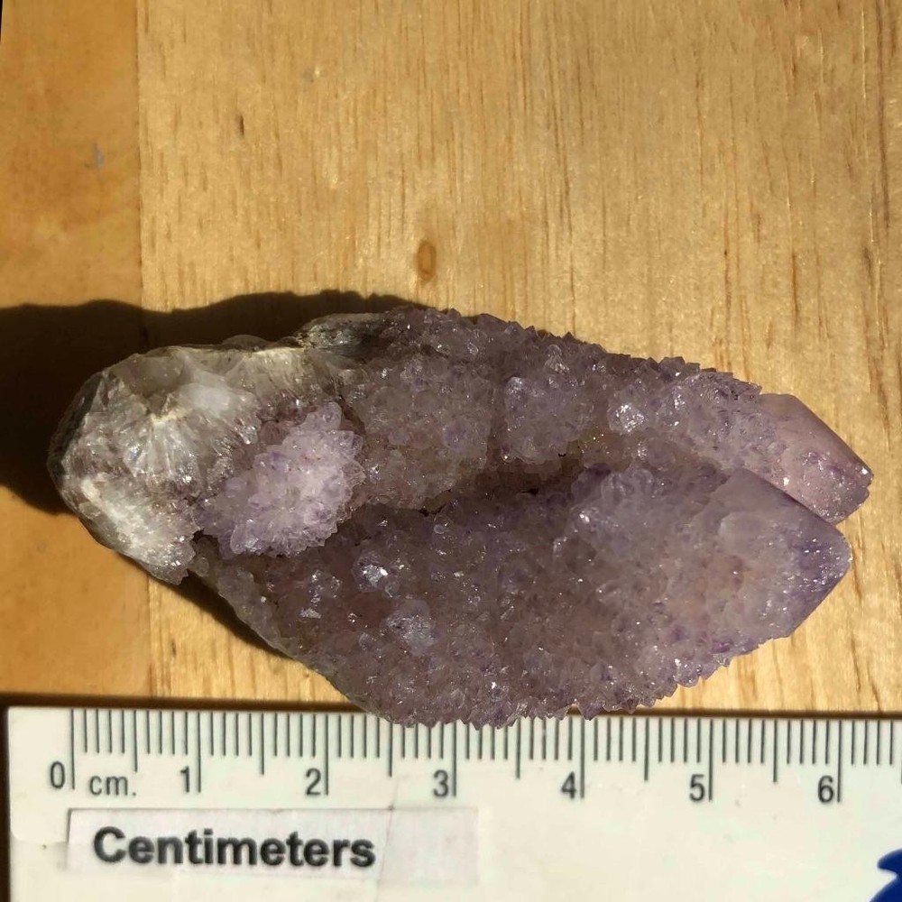Cactus Quartz or Spirit Quartz Size Approximately See Centimeter Ruler View My Other Items For Sale Visit My eBay Store Add me to your Favorite Sellers A cactus or spirit quartz is a quartz crystal that is encrusted by a second generation of smaller crystals grown on its prism faces. These crystals were first discovered in 1986 in the Magaliesberg Mountain Range near Pretoria, South Africa. Cactus quartz is formed by a quartz or amethyst crystal being encrusted by a second generation of smaller crystals grown on its faces. It occurs as quartz, citrine and amethyst, and comes in a wide range of colors, including purple amethyst, violet amethyst, smoky, milky clear and golden citrine. FAQ/Tips Crystals are priced by quality, color and size. Purple amethyst is more highly prized and will cost more for a smaller lesser quality crystal. Lavender is the most common color and where you will find the best quality/value for price Crystals change colors with changes in type angle and intensity of light. Color may also vary between monitors. Pictures were taken in bright natural light. We do our best to give you many views so you can judge the quality of the given crystals. If you have questions please ask before bidding or buying. Many of the crystals have special color properties: Many have phantoms, not just the ones we’ve indicated. Some have “floating” purple tips. The placement of darker purple against purple or white crystals appears to change as the crystal is turned. Many are a mixture of citrine and amethyst. The ones called “Golden Healers” or “Sunshine” have a rainbow effect on crystal faces. To get combined shipping please use the shopping cart and click on request invoice. Wait until you get one from us to pay Thank you for looking. Please check out our other items. Images sell! Get Supersized Images & Free Image Hosting Attention Sellers - Get Templates Image Hosting, Scheduling at Auctiva.com. Track Page Views With Auctiva's FREE Counter