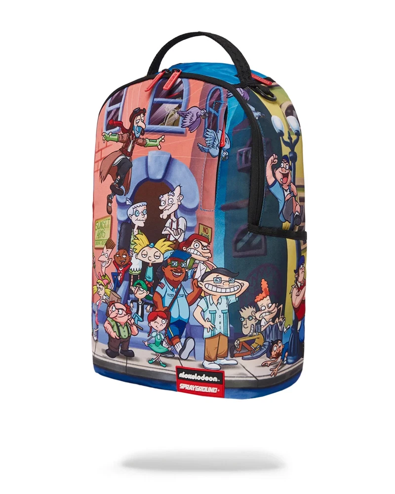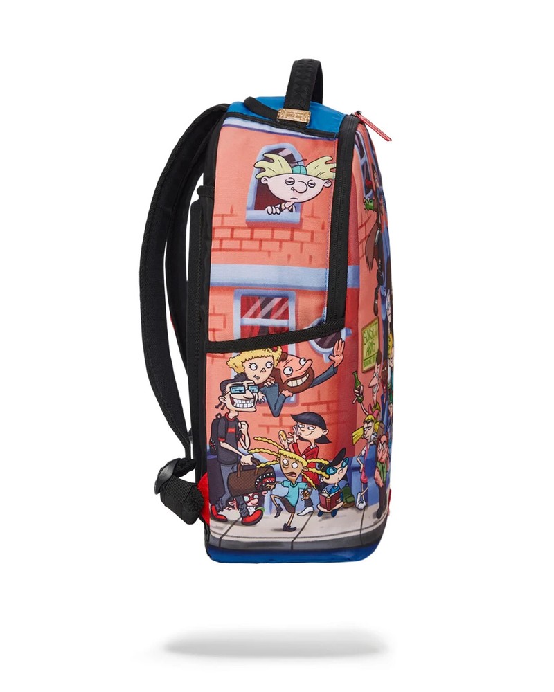 This is a Sprayground Hey Arnold Anniversary Backpack (DLXR) in a large size, designed for unisex adults. It features a multicolor design with faux leather and polyester materials. The backpack is part of the Sprayground brand and is styled with the iconic Hey Arnold theme. DLXR = 100% RECYCLED POLYESTER FABRIC PRODUCT DETAILS Exterior Dimensions: 18" x 6" x 11.5" ∙ Front zipper pocket ∙ Side pockets ∙ Zippered Stash pocket ∙ Ergonomic mesh back padding ∙ Adjustable Straps for custom sizing ∙ Nylon Zippers with Metal Hardware ∙ Metal "Sprayground Authentic" badge ∙ Slide through back sleeve connects to Carry on luggage to free your hands Interior Separate Laptop compartment ∙ Separate Velour sunglass compartment ∙ Mesh organizer pocket Fabric Durable 900D Poly water-resistant fabric 100% RECYCLABLE MATERIAL