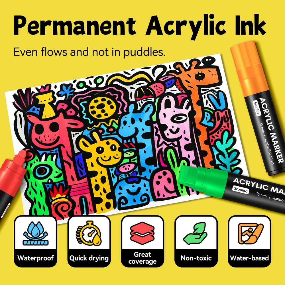 Jumbo Markers Set: SRUOLOC jumbo markers are made with the highest quality water-based acrylic ink. That is waterproof, quick-drying, permanent , and smooth flow Non-Toxic and Safe – SRUOLOC paint markers are non-toxic, Each thick permanent marker meets ASTM d-4236 and EN-71 safety standards, are suitable for artists of all ages, working seamlessly on rock, fabric, glass, wood, plastic, paper, and more 3-IN-1 NIB: (fine, medium, and jumbo) The thick tip permanent markers set felt wide tip is not only equipped with 3-IN-1 nib, but also allows the jumbo marker paint pen to produce smooth and even ink MULTI-SURFACE: Our permanent jumbo poster markers are versatile enough to be used on a variety of surfaces, ideal for wall-painting, posters, stone, ceramic, glass, wood, fabric, canvas, plastic, metal, resin, terracotta, seashell, and more The permanent markers 12 color set is perfect for artists to use on DIY designs, arts, and crafts, and painting projects