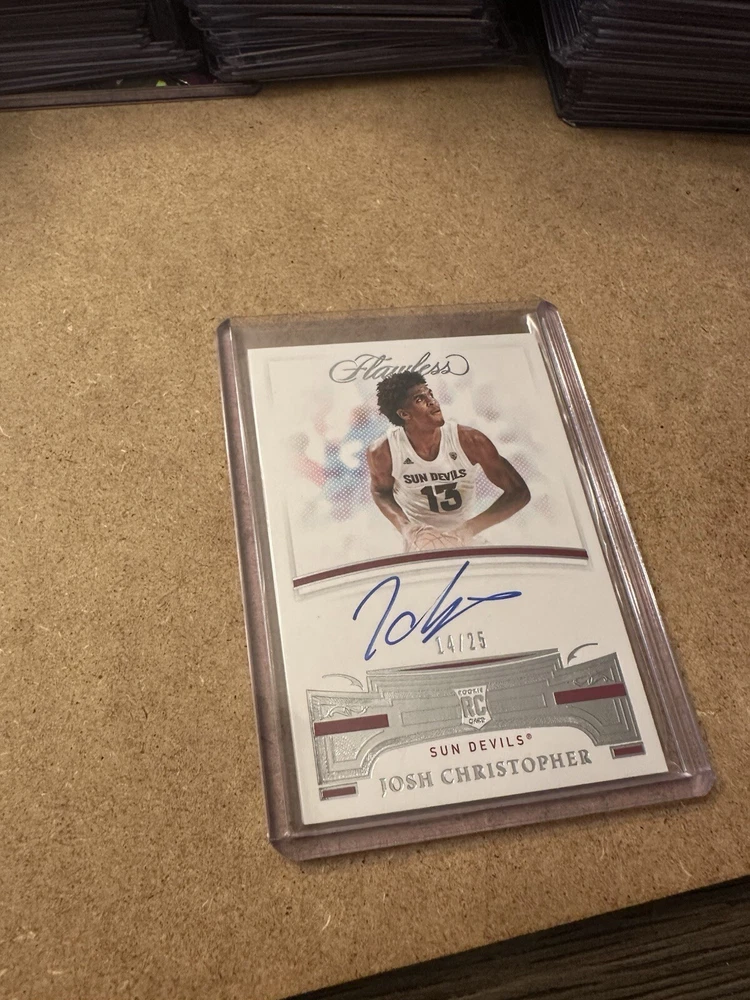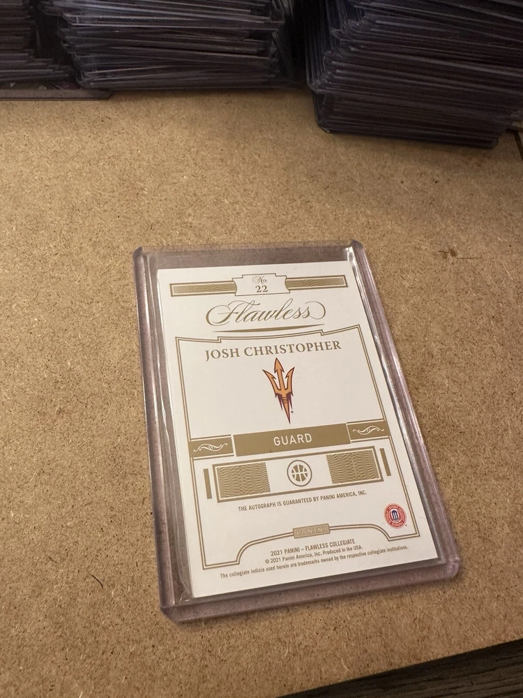 This is a rare Josh Christopher 2021 Flawless Collegiate Team Logo Signatures autographed rookie card, numbered out of 25. Manufactured by Panini, the card features Christopher in his Arizona State Sun Devils college uniform and could also represent his NBA teams, the Houston Rockets or Miami Heat. It is a highly collectible piece with on-card autograph, limited edition status, and memorabilia elements, making it a desirable addition for basketball card enthusiasts and fans of the young player.