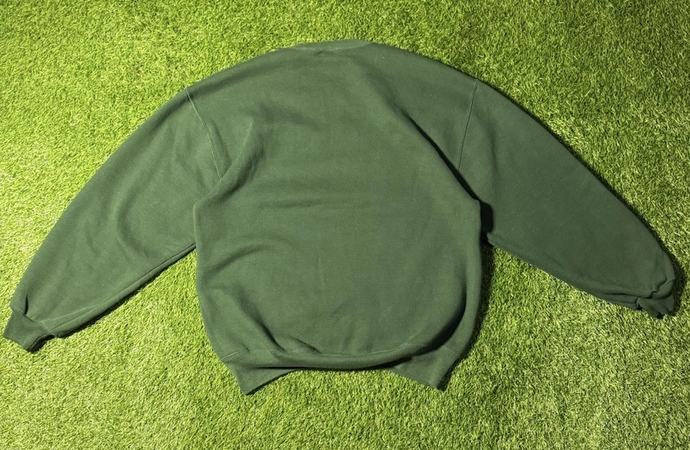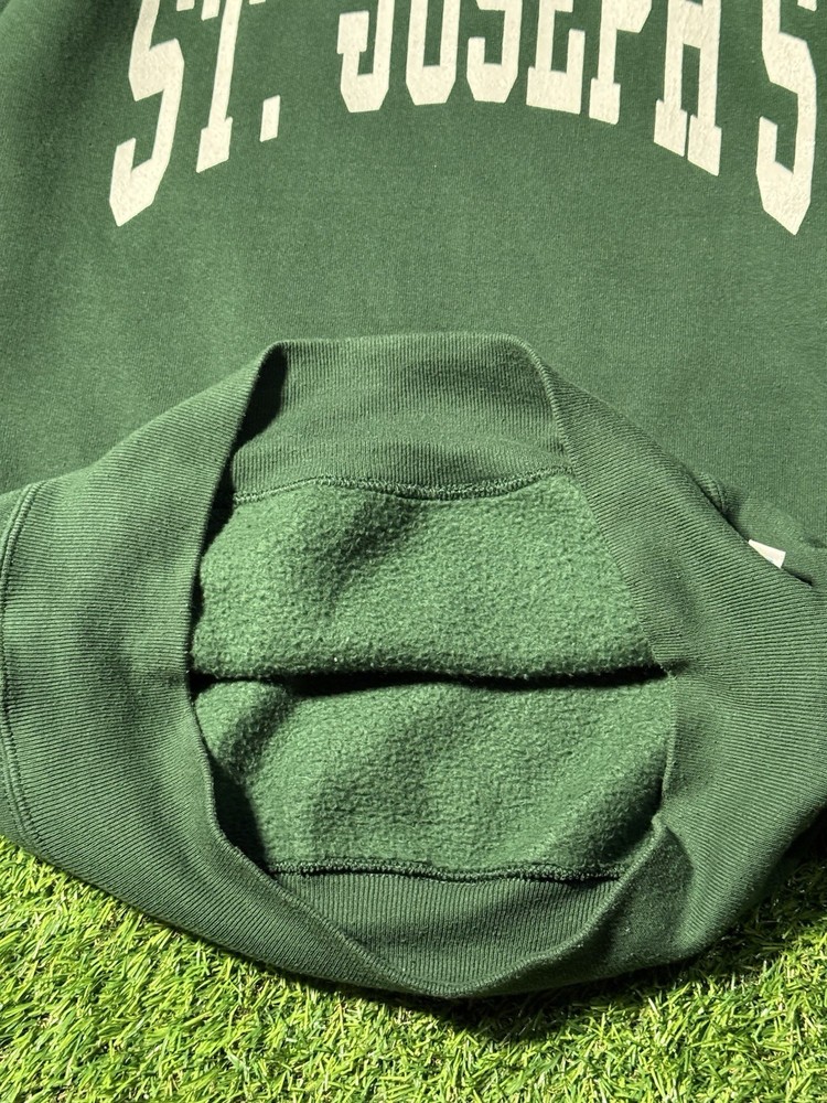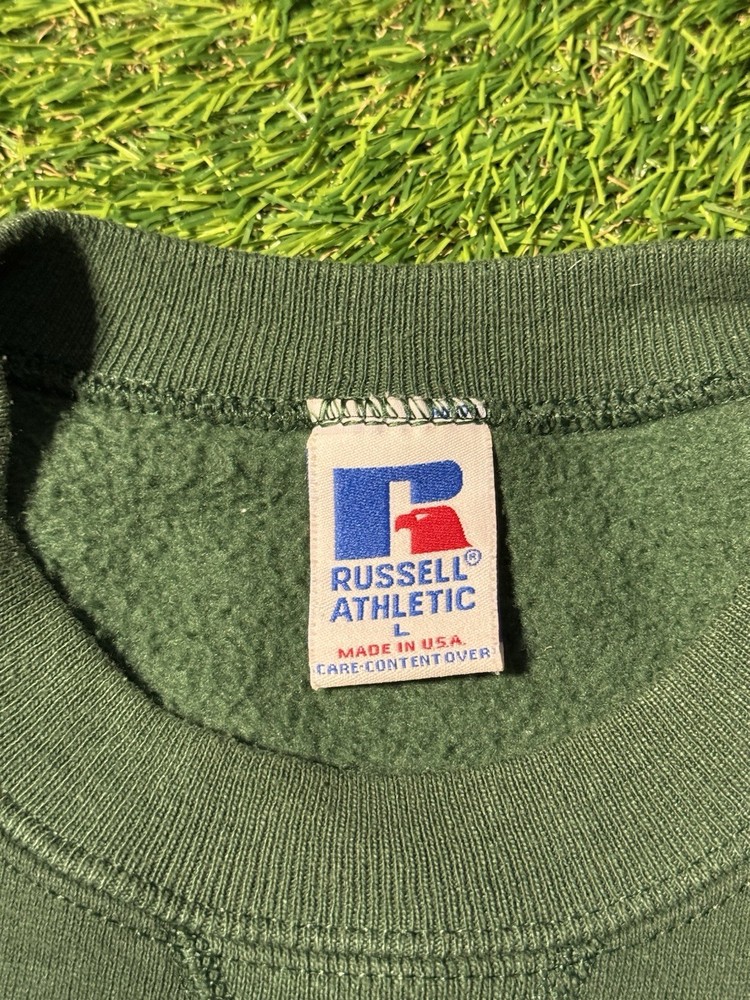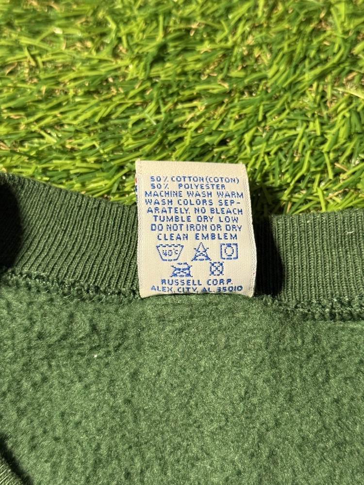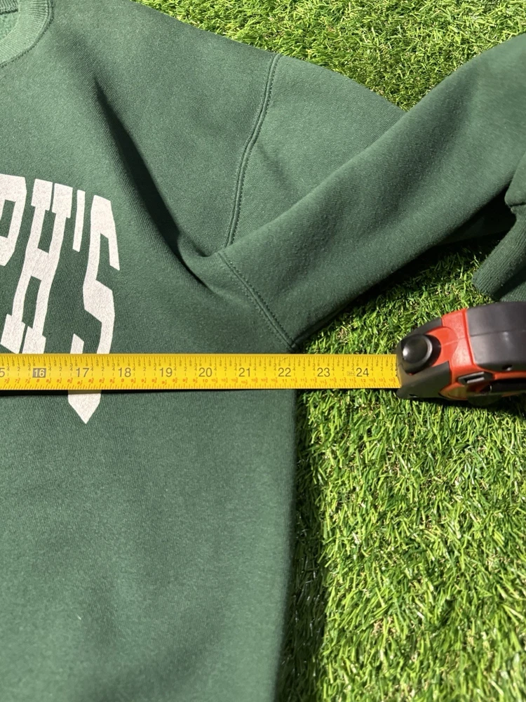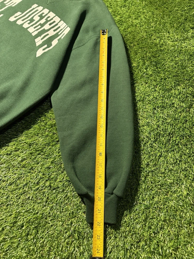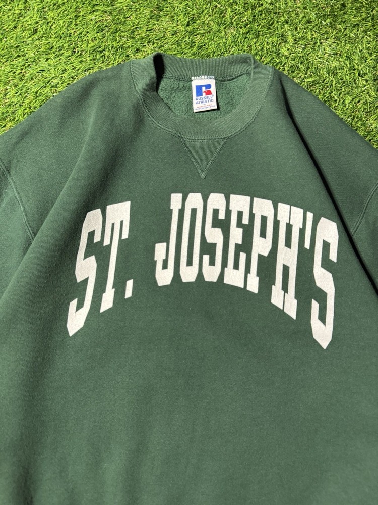 Rare Vintage Russell Athletic green crewneck sweatshirt featuring a graphic print logo, perfect for fans of ST John's University. Made of a blend of polyester and cotton, this pullover sweatshirt is cozy and comfortable to the touch, making it ideal for the winter, fall, and spring seasons. With a classic 90s USA style, this lightweight and breathable sweatshirt is machine washable and suitable for various activities such as tennis, cycling, golf, basketball, and more. Show off your school spirit with this retro piece that embodies the preppy and outdoor themes of the past.