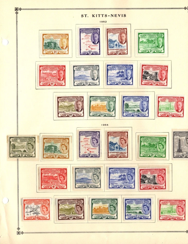 This Saint KItts and Nevis collection contains stamps issued from1949 to 1957 mounted on Scott International Album pages (Parts II & III). The Scott catalog value (2024) is $112.40.
