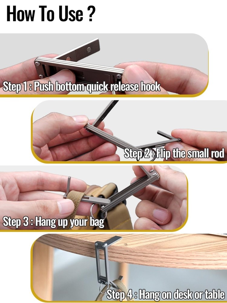 ST5 Titanium Purse Hook for Table – Foldable Bag Hanger with Anti-Slip Arm – Portable Handbag Holder for Dining, Office, and Travel 1️⃣ Strong & Stylish Bag Hook for Tables: Made from lightweight titanium, this purse hook holds your handbag securely at any table edge while keeping it clean and safe. 2️⃣ No More Bags on Dirty Floors: Keep your purse, tote, or backpack off restaurant and cafe floors with this simple yet effective folding table hook. 3️⃣ Anti-Slip Arm for Secure Grip: Designed with anti-slip points to ensure your bag stays in place without slipping or sliding. 4️⃣ Folds Flat – Easy to Carry: Compact and foldable, easily clip this portable hook onto your handbag strap or drop it into your purse for everyday convenience. 5️⃣ Ideal for Dining, Office, and Travel: Perfect for use in restaurants, cafes, offices, or while traveling – keeps your essentials elevated and within reach.