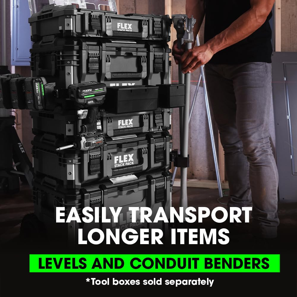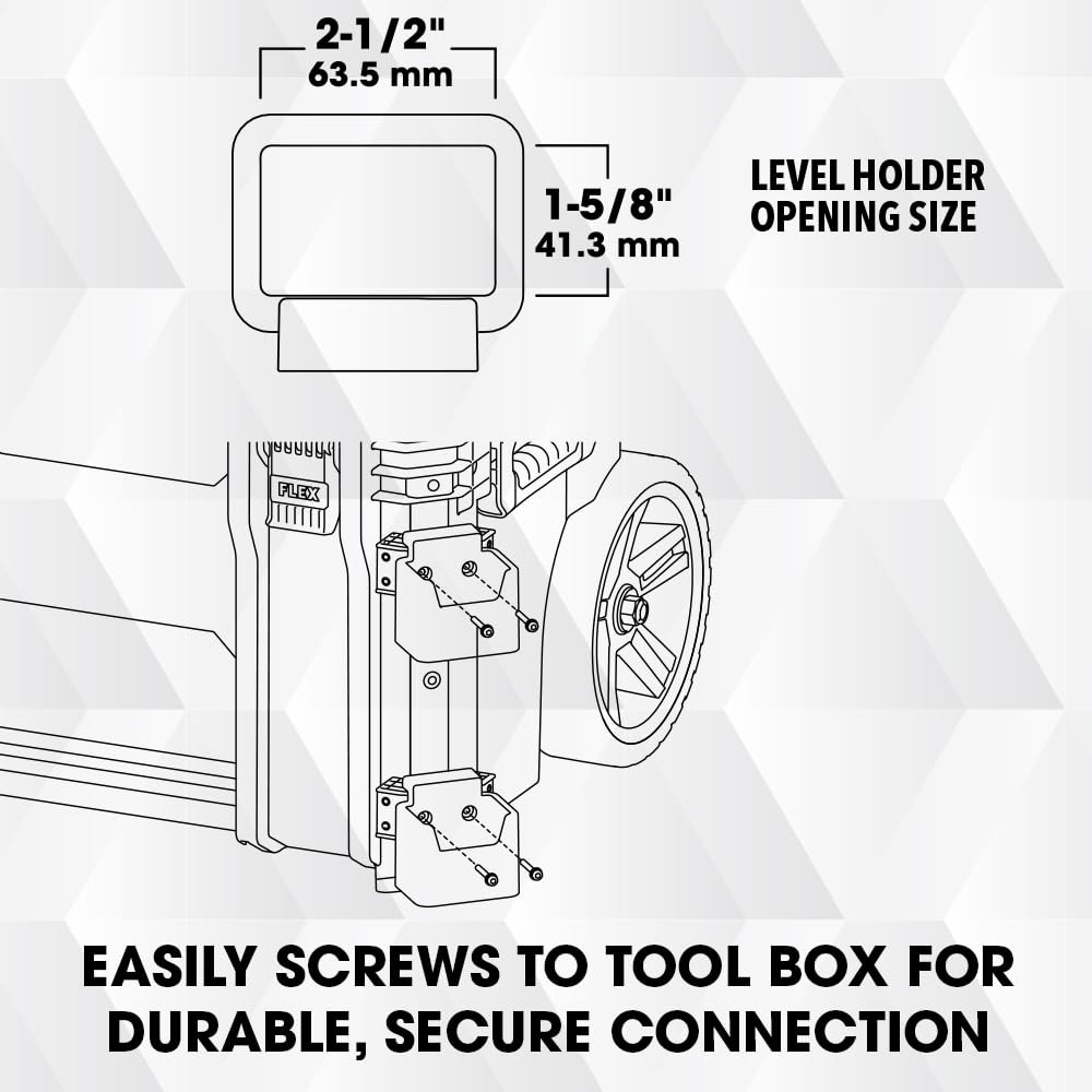 Easily secure and transport long, unwieldy items like levels and conduit benders with the STACK PACK™ Level Holder so you go to and from the jobsite with ease. It easily attaches to cases in the STACK PACK™ storage system. STACK PACK - Fits with select STACK PACK tool boxes. Ideal for the Rolling Tool Box (FS1101), Medium Tool Box (FS1102), and Suitcase Tool Box (FS1103). Level holder opening size: 2 1/2 inches by 1 5/8 inches EASILY TRANSPORT LONG ITEMS - Secure and transport long items like levels and conduit benders DURABLE CONSTRUCTION - Made from a hard plastic known for its durability to keep your tools secure QUICK INSTALLATION - Easily screws to tool box for durable, secure connection WHAT'S INCLUDED - (1) STACK PACK Level Holder, (2) STACK PACK Corner adaptors, fasteners for installation FULL RANGE COMPATIBILITY - STACK PACK toolboxes, organizers, accessory cases, and toolbox attachments are endlessly configurable across the full STACK PACK system