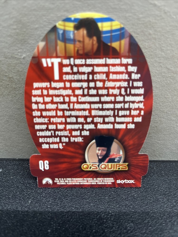 This Star Trek: Generations trading card features Q's quips and is a must-have for any fan of the iconic TV show. The card is made of high-quality card stock and has a standard size. It is an original, licensed reprint from the year 2000 and is part of the Star Trek The Next Generation Profiles set. The card is a non-sport trading card with English language and features insert, foil, chase, and die-cut insert elements. It has a card number of Q6 and is manufactured by SkyBox. The card is perfect for collectors of action, sci-fi, adventure, fantasy, and TV & movies genres. The featured persons/artists are John De Lancie and Olivia D'Abo.