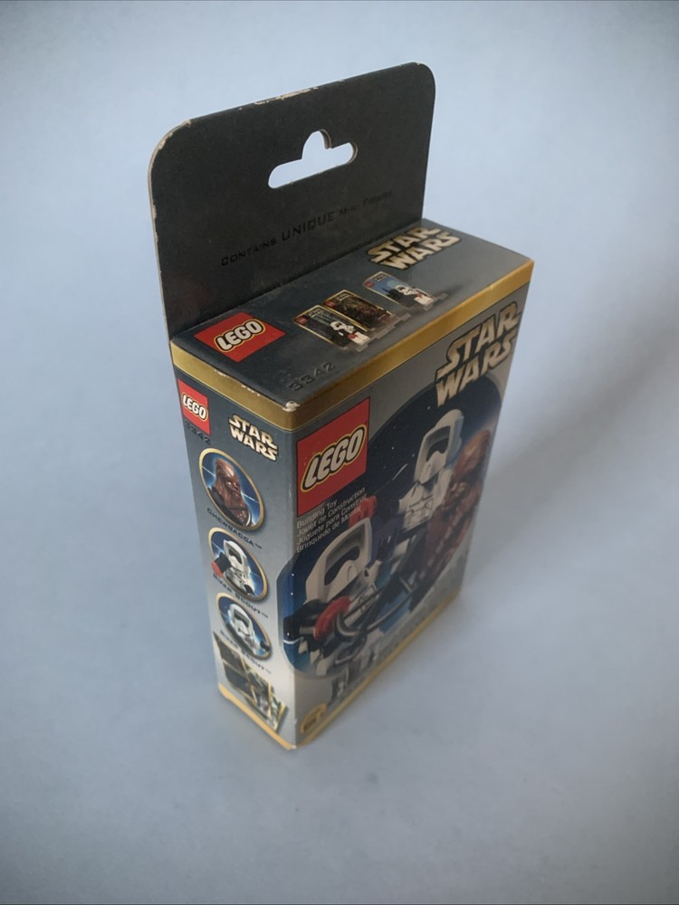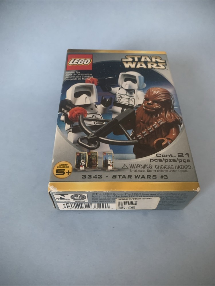 This is a rare, retired LEGO set number 3342 from the Star Wars theme released in 2000. It features Chewbacca and 2 Biker Scouts. The set contains 21 pieces and comes in a box packaging. It is designed for ages 2 and up, was made in Denmark, and is no longer in production.