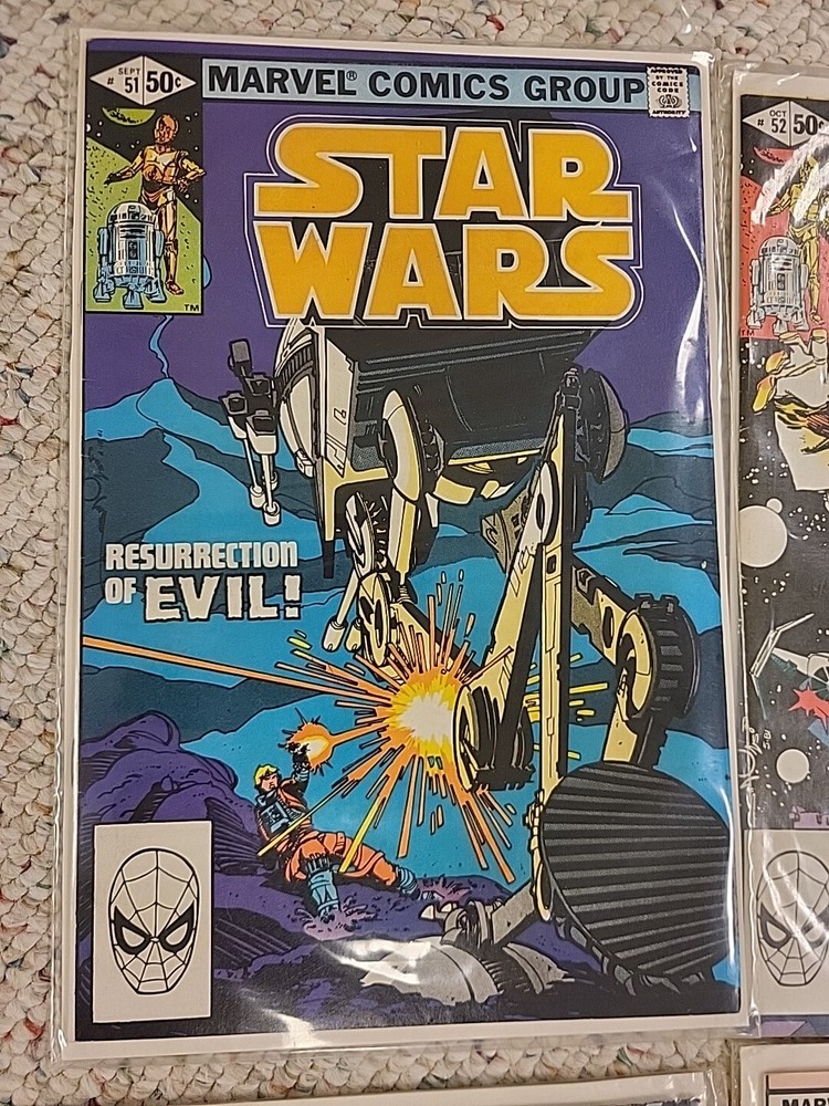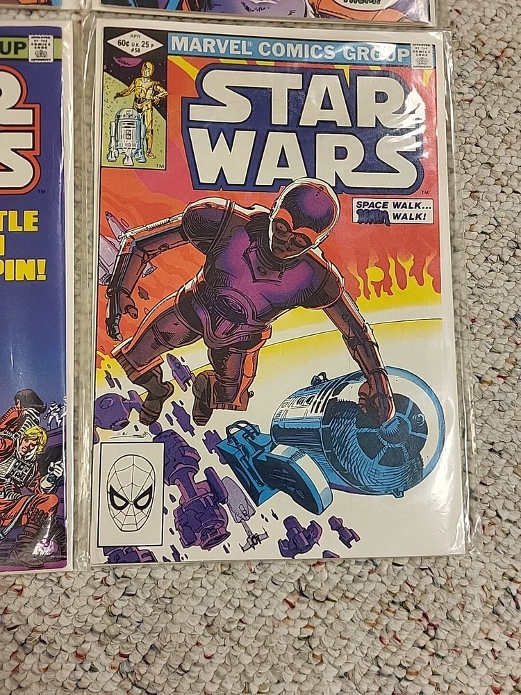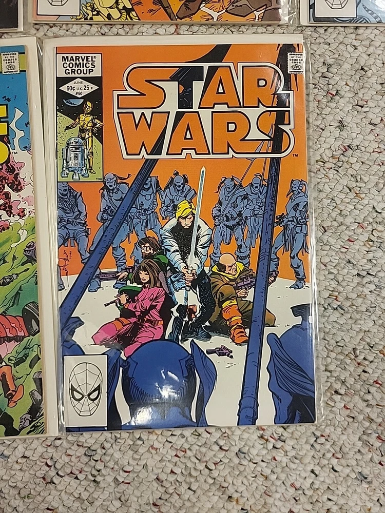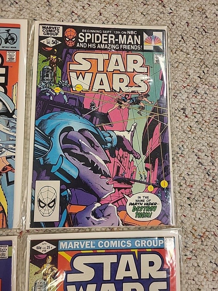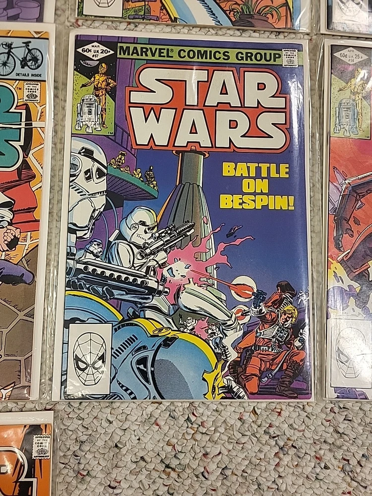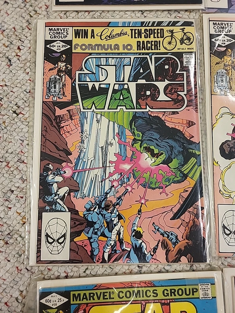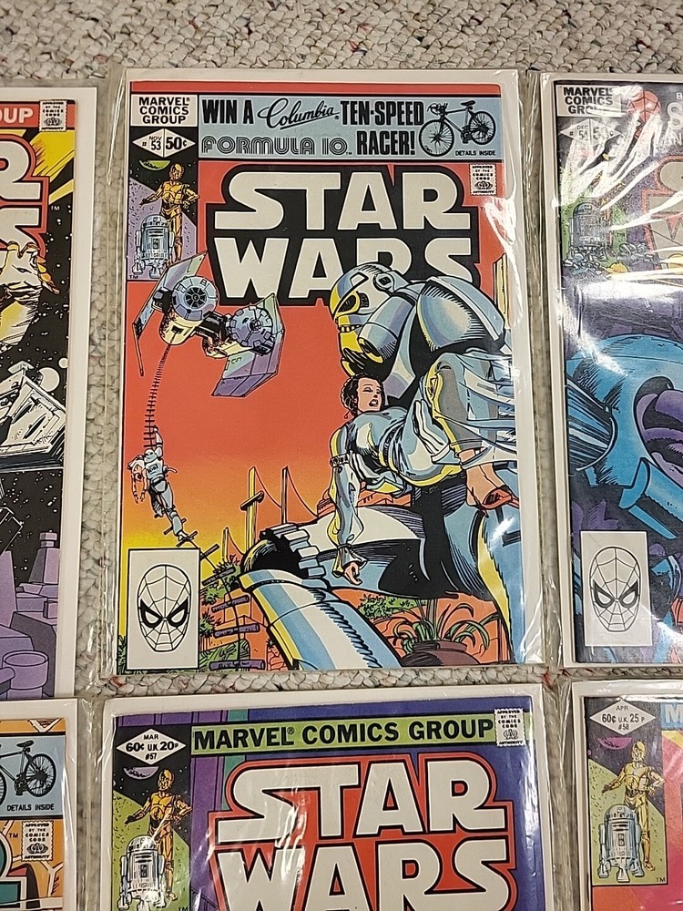 The product is a lot of 10 Star Wars comic books from issues #51-60, published by Marvel Comics in 1982. These vintage comics feature characters such as R2-D2 and Princess Leila from the Star Wars universe. The comics are in English language, softcover format, and intended for a general audience. They are from the Bronze Age era of US comics and offer a glimpse into the popular culture and storytelling of that time period. Perfect for fans of both Star Wars and comic book collectors, this lot of comics are a piece of history in the world of comic books and graphic novels.