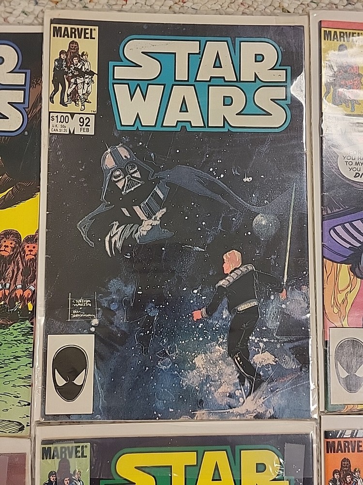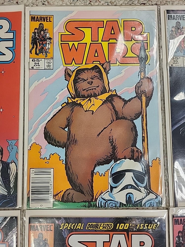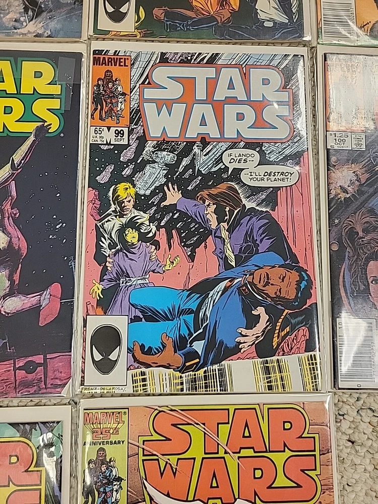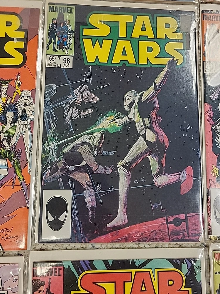 This product is a lot of 13 Star Wars comic books from the Marvel Comics series, specifically issues #91-95, #97-103, and #105 from 1982. The comics feature beloved characters like R2-D2 and Princess Leila in the Star Wars universe. These vintage comics are in English and were published by DC in the United States during the Bronze Age era of comic books. They are softcover and come boarded, making them a valuable addition to any comic book collection for fans of both Star Wars and Marvel.
