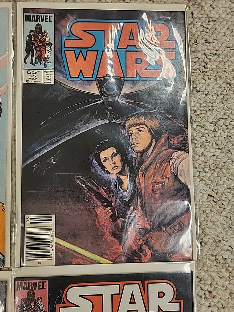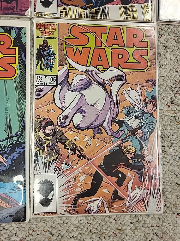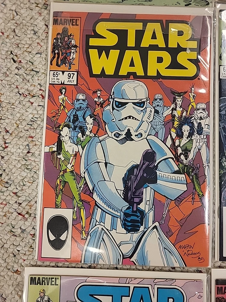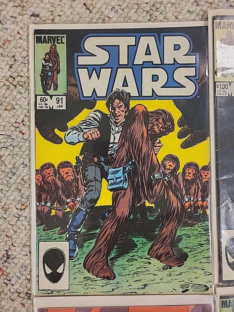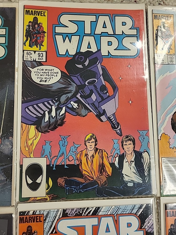 This product is a lot of 13 Star Wars comic books from the Marvel Comics series, specifically issues #91-95, #97-103, and #105 from 1982. The comics feature beloved characters like R2-D2 and Princess Leila in the Star Wars universe. These vintage comics are in English and were published by DC in the United States during the Bronze Age era of comic books. They are softcover and come boarded, making them a valuable addition to any comic book collection for fans of both Star Wars and Marvel.