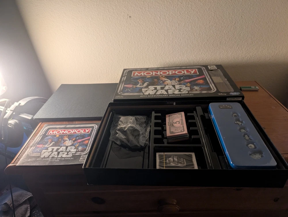 Condition: USED (OPEN BOX ) See Photos For More Details The product is a special edition of Monopoly called "Monopoly Star Wars," specifically the 40th Anniversary Special Edition. It features a Star Wars theme and is branded by Hasbro. The game board is based on the iconic Monopoly gameplay and is suitable for 2 players or more, with an age range of 8 years and up. The game is set in the war-themed universe of Star Wars and has never been opened, making it a collectible item for fans of both Monopoly and Star Wars.