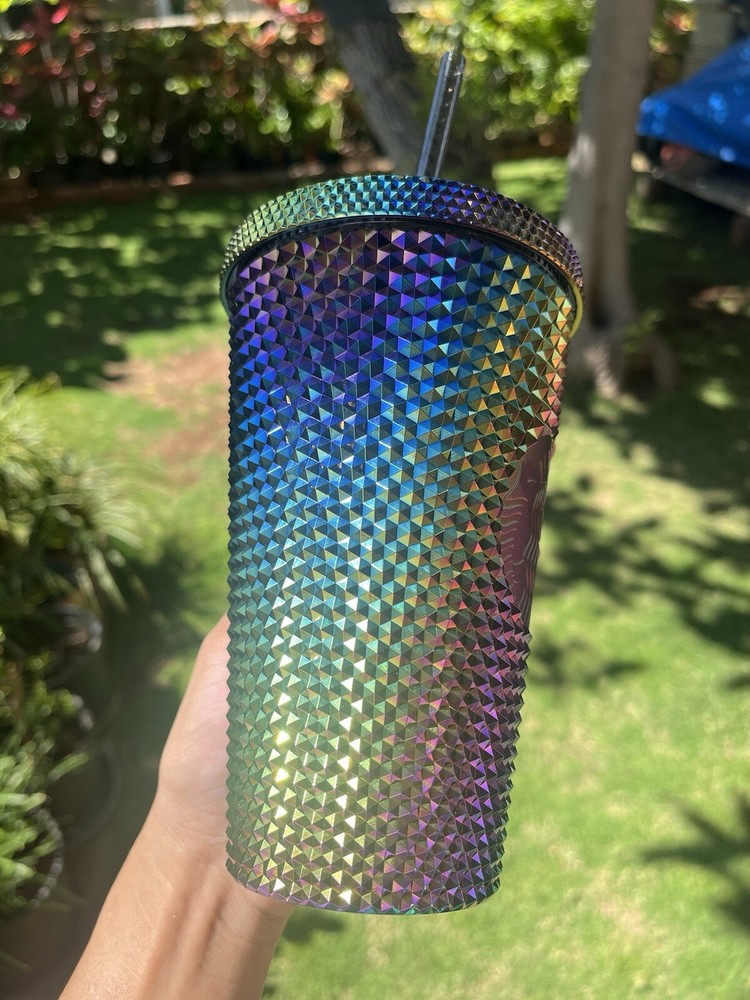 Wow, this tumbler is absolutely stunning! The oil slick rainbow colors shift beautifully in the light, and the studded detail gives it such a chic, edgy vibe. It keeps my drinks at the perfect temperature and feels so sturdy. Every time I use it, it just makes my day a little brighter. A total must-have for any Starbucks fan!