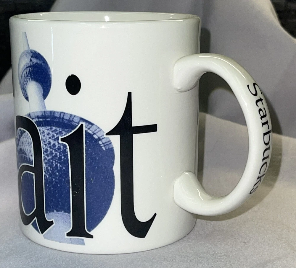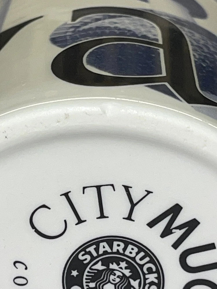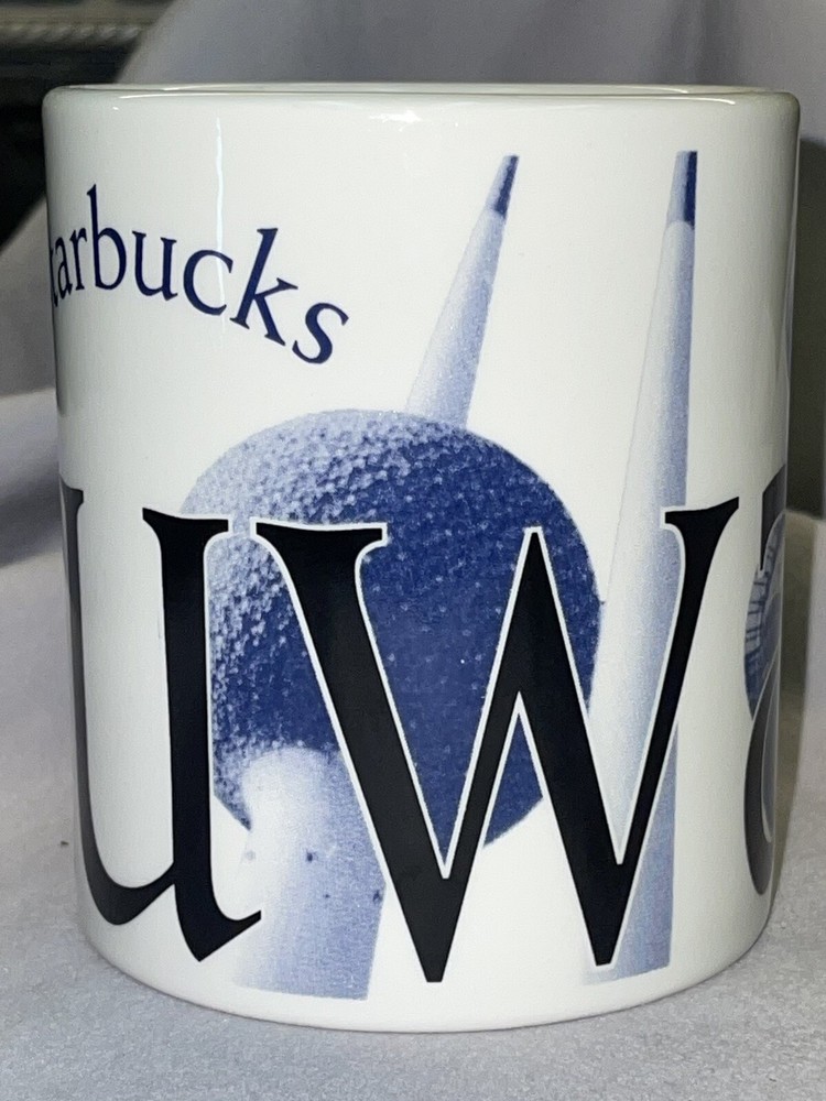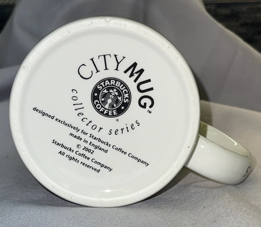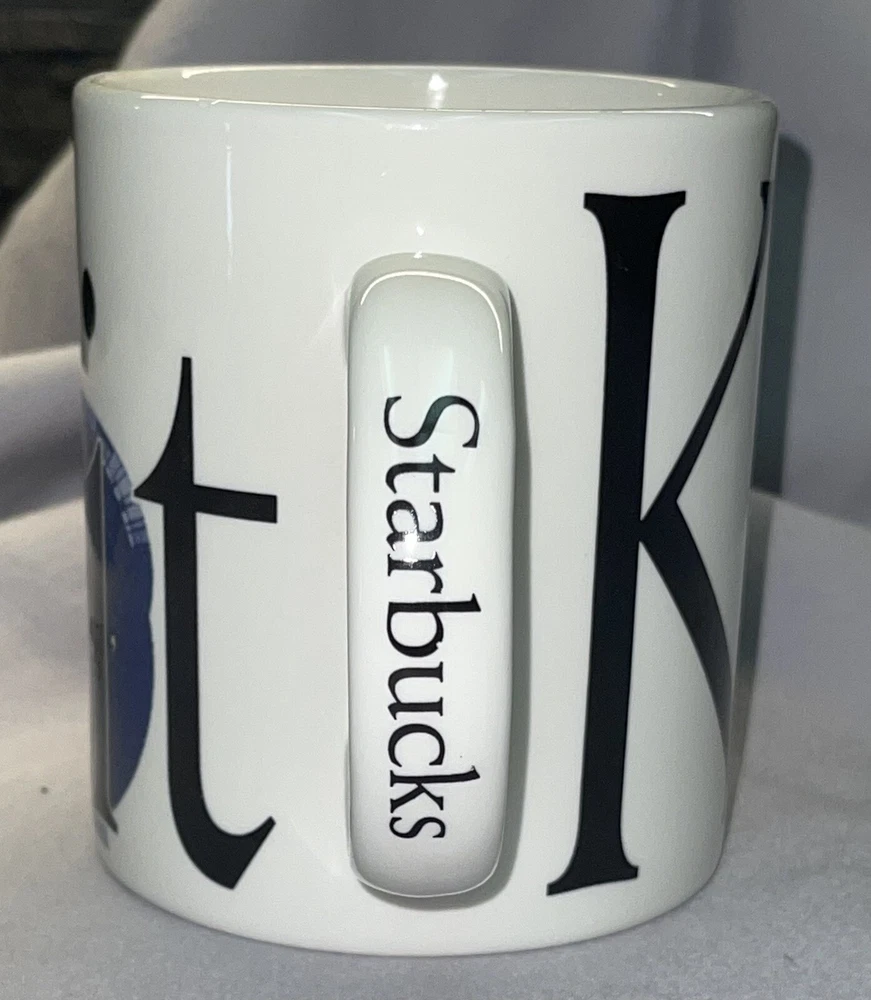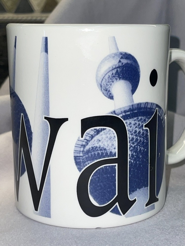 STARBUCKS City Mug Collectors Series KUWAIT Coffee/tea/cocoa mug. Made in England 2002. Coffee mug is in good condition with no breaks, cracks, stir marks or repairs. There are two little chips on the bottom ring of the mug, see pictures, with the most notable being under the "A" in Kuwait. There is also a small pinhole in the "K" of Kuwait. There is a roughness that is hard to see in the pictures, on the inside of the handle. It looks like a part of the glaze. Mug still displays and functions well.