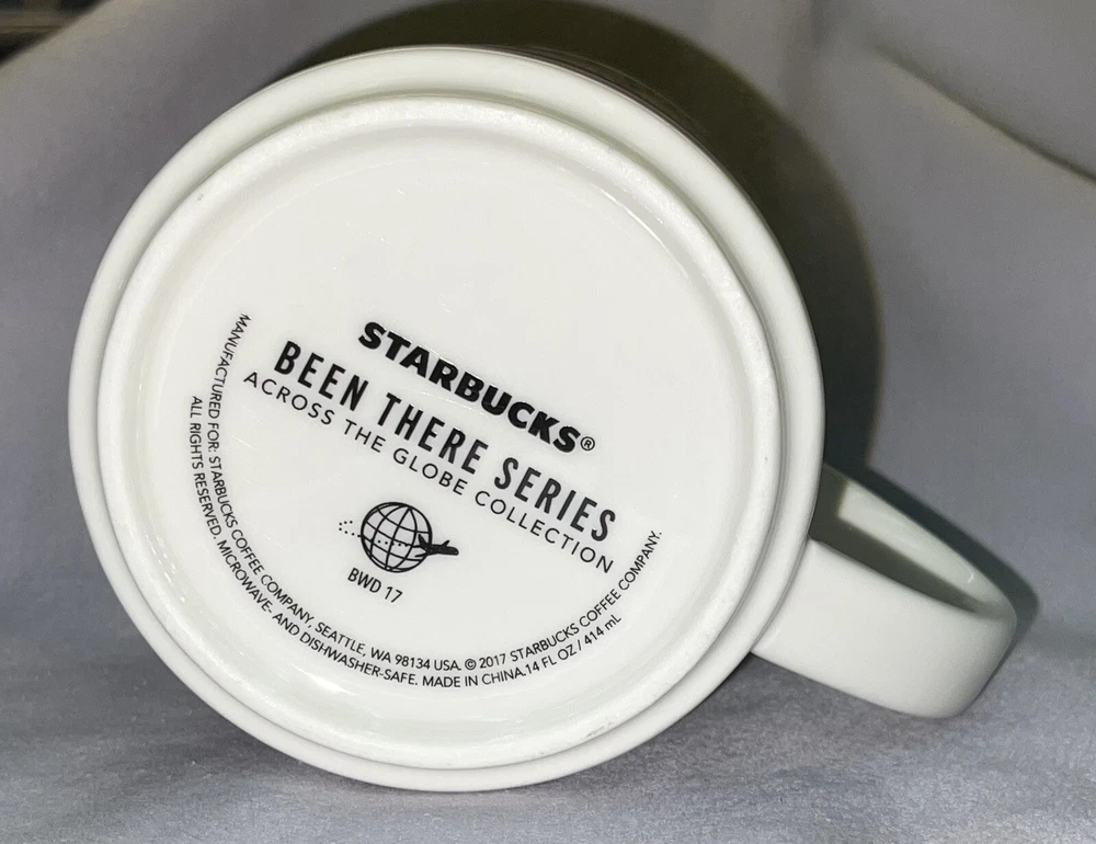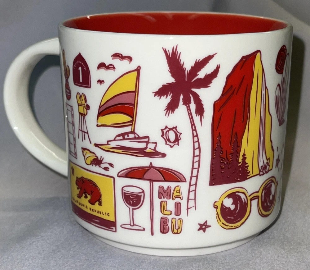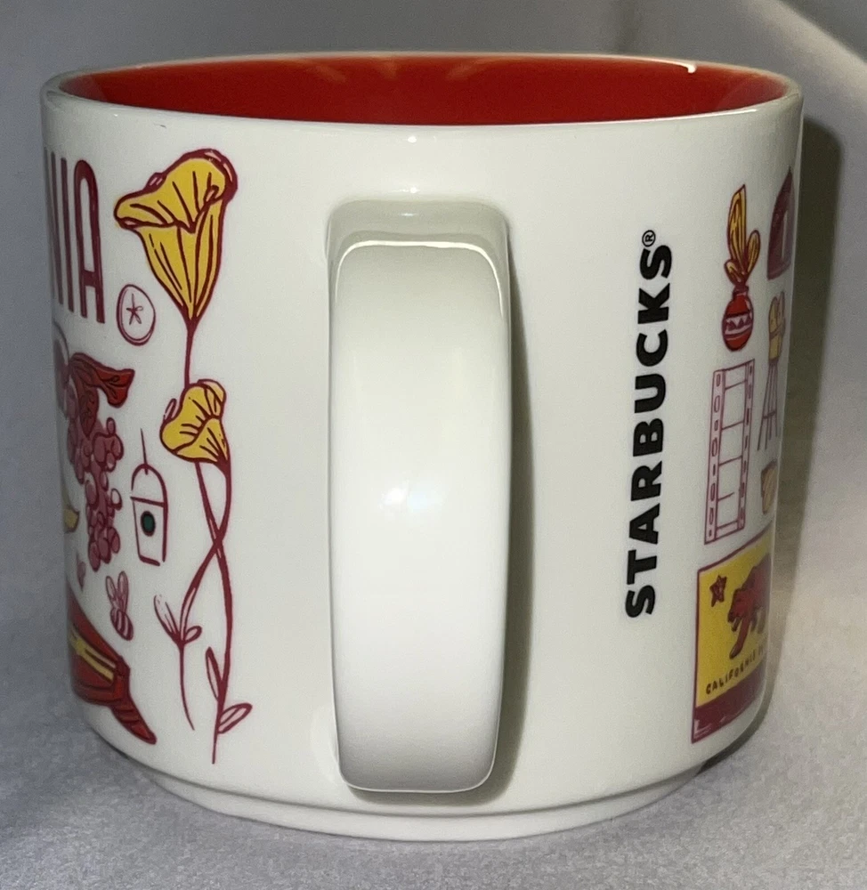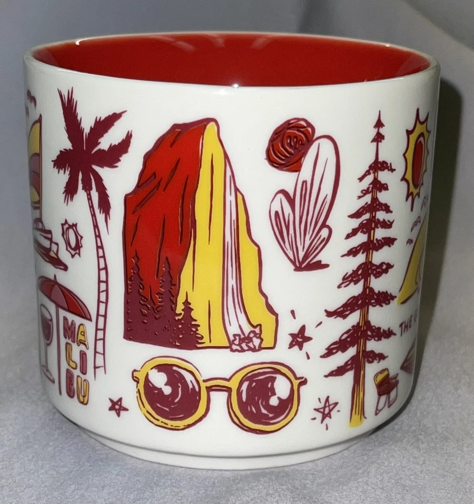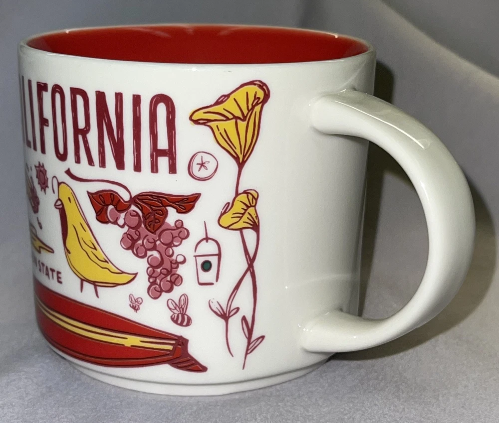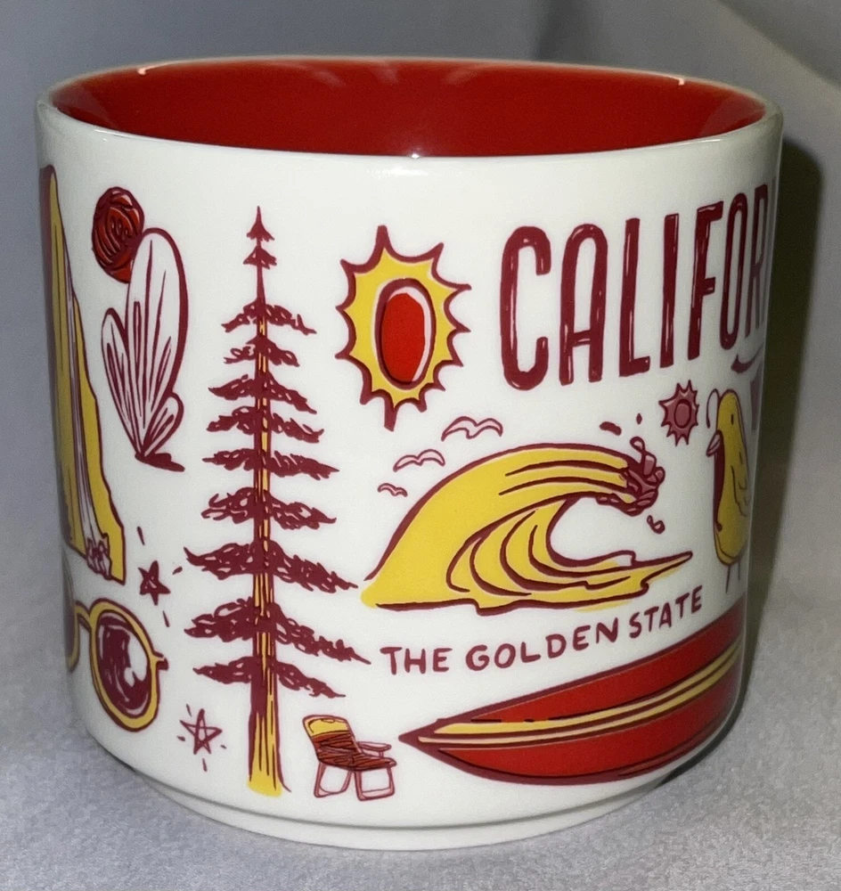 STARBUCKS Across the Globe Collection, Been There Series, CALIFORNIA 14oz Coffee, Tea, Cocoa Mug. Mug is in great condition with no breaks, chips, cracks or repairs to the mug. Coloring is excellent with no wear or missing colorization. No stir marks in the bottom of the mug. The Golden State, Redwoods, Palm Trees, Malibu, Highway 1, grapes, surfboard and more adorn the mug.