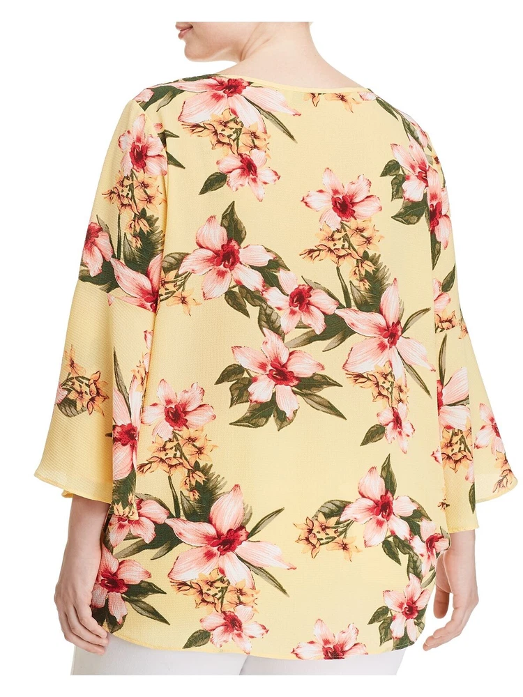 STATUS BY CHENAULT Womens Yellow Floral Bell Sleeve V Neck Evening Top Plus 2X