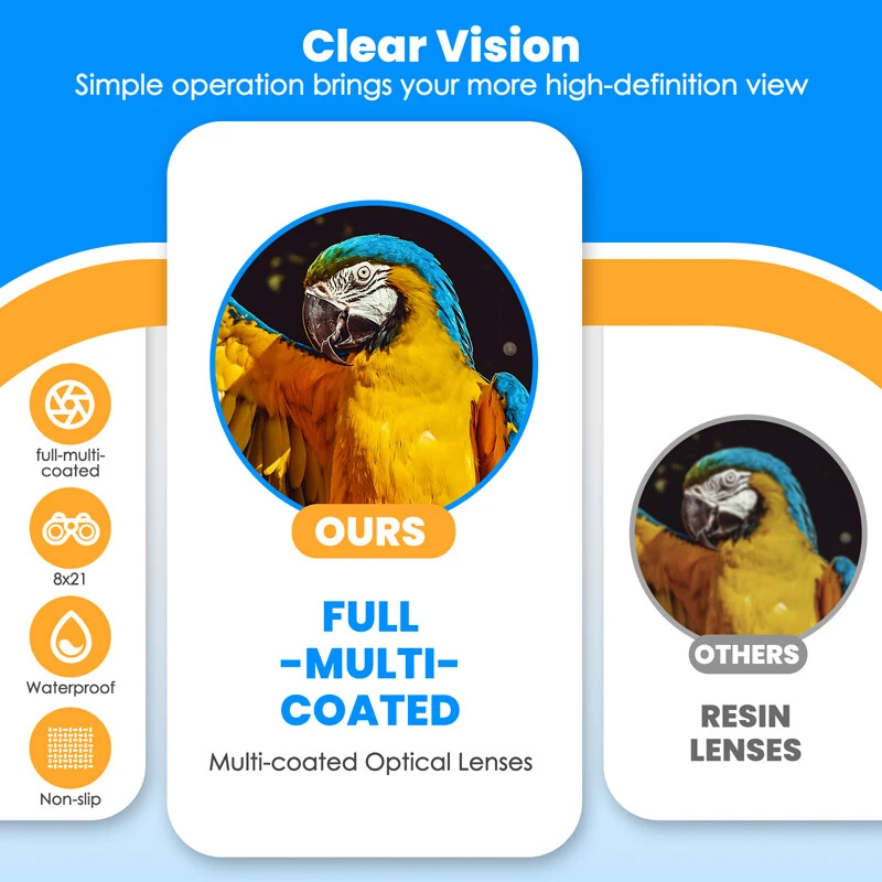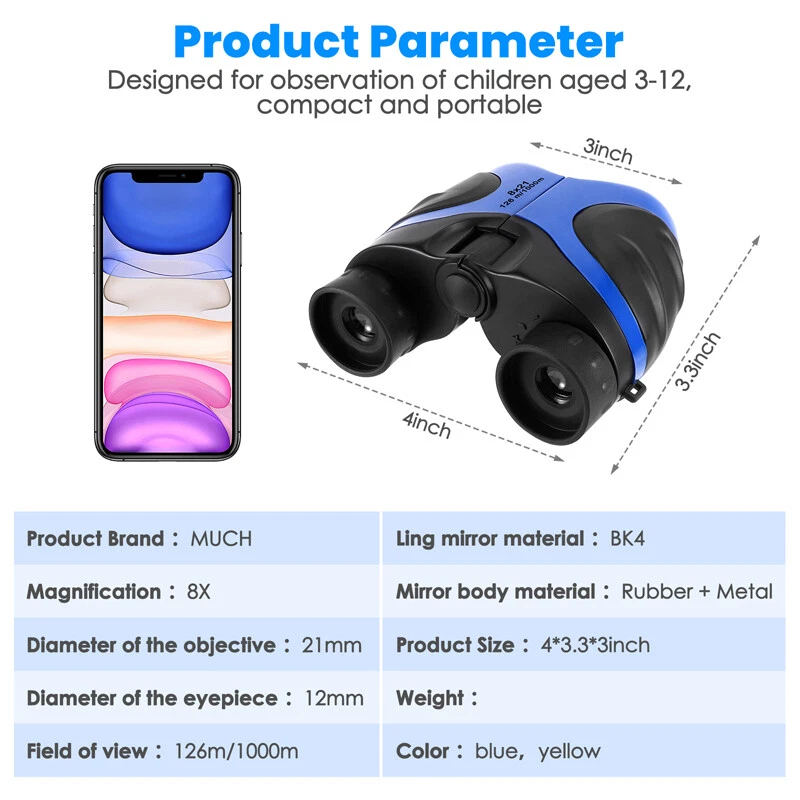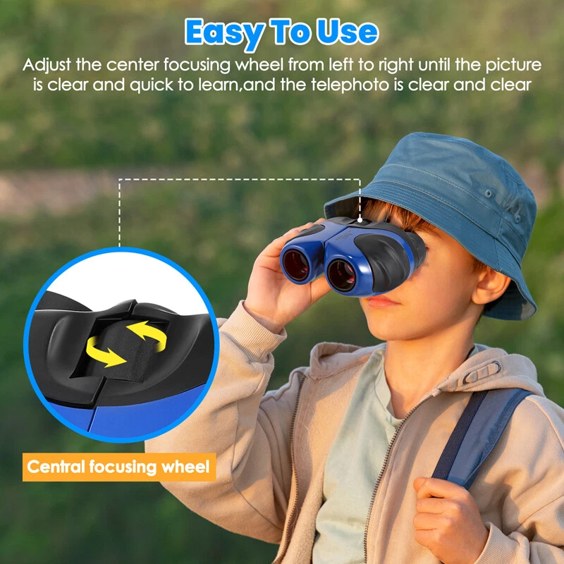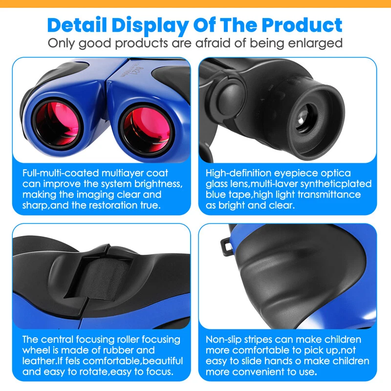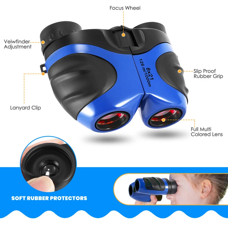 Kids Children's Pocket Mini Binoculars 8x21 Color Adjustable Focus Telescope Feature: -- Safe and Reliable: There is soft rubber around the eyepiece to protect children's eyes, while there is an extra coating around the eyepiece to protect the lens when dropped. -- Advanced Design: Non-slip scratches, the grip is ergonomically designed to fit children's hands, easy to focus, and can see a clear view. -- HD Field of View: With 8x magnification, wide field of view, the binoculars can be adjusted, perfect for bird watching, learning, hunting, theater, hiking. -- Shockproof Function: The durable telescope is coated with shock-absorbing rubber to withstand drops on the ground, and the shockproof rubber can protect the telescope from damage. Specification: Color: Blue Material: rubber + plastic Field of view: 126m/1000m Magnification: 8 times Diameter of objective: 21mm Diameter of eyepiece : 12mm Focusing type: center focusing Product size: 11*8.5*7.5cm/4*3.3*3inch Package includes: 1x Telescope 1x Lanyard 1x Cleaning Cloth 1x Instruction Manual 1x Packaging Bag 1x Packing Box Payment Delivery details Terms of sales About us Contact us Payment Payments: Paypal, Google Pay, Visa, Master Card, Amerian Express, Discover. Delivery details All items are shipped from US warehouse. ππ π We have 2 wharehouse in US, one is in NJ and the other is in CA. ππ π We will ship from the warehouse closest to the buyer's delivery address. Don't hesitate make orders ! We ship to your eBay or Paypal address. Please make sure your eBay or Paypal address is correct before you pay. Terms of sales Free return About us Pls contact our customer service firstly if have any problems , we will help to solve the issue, and could offer free return service for full refund or free replacement after confirming. You can buy from us with confidence Contact us If have any problems, please feel free to contact us.