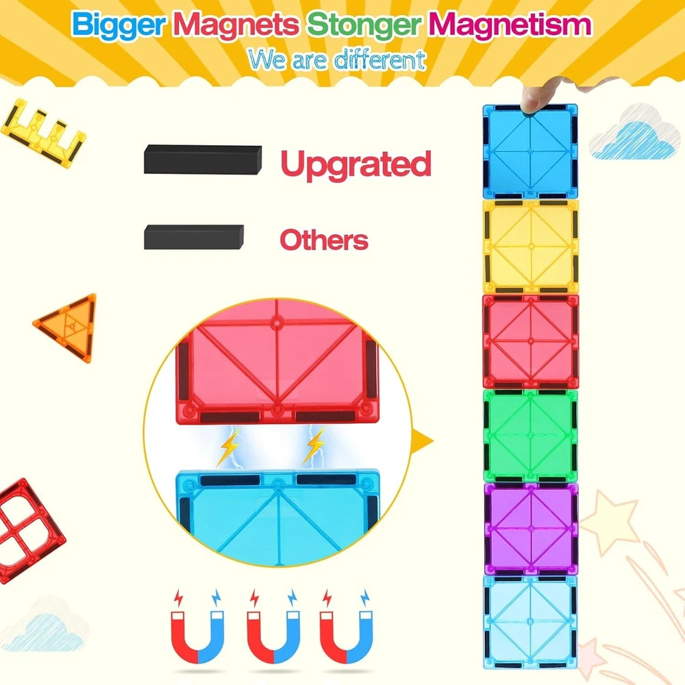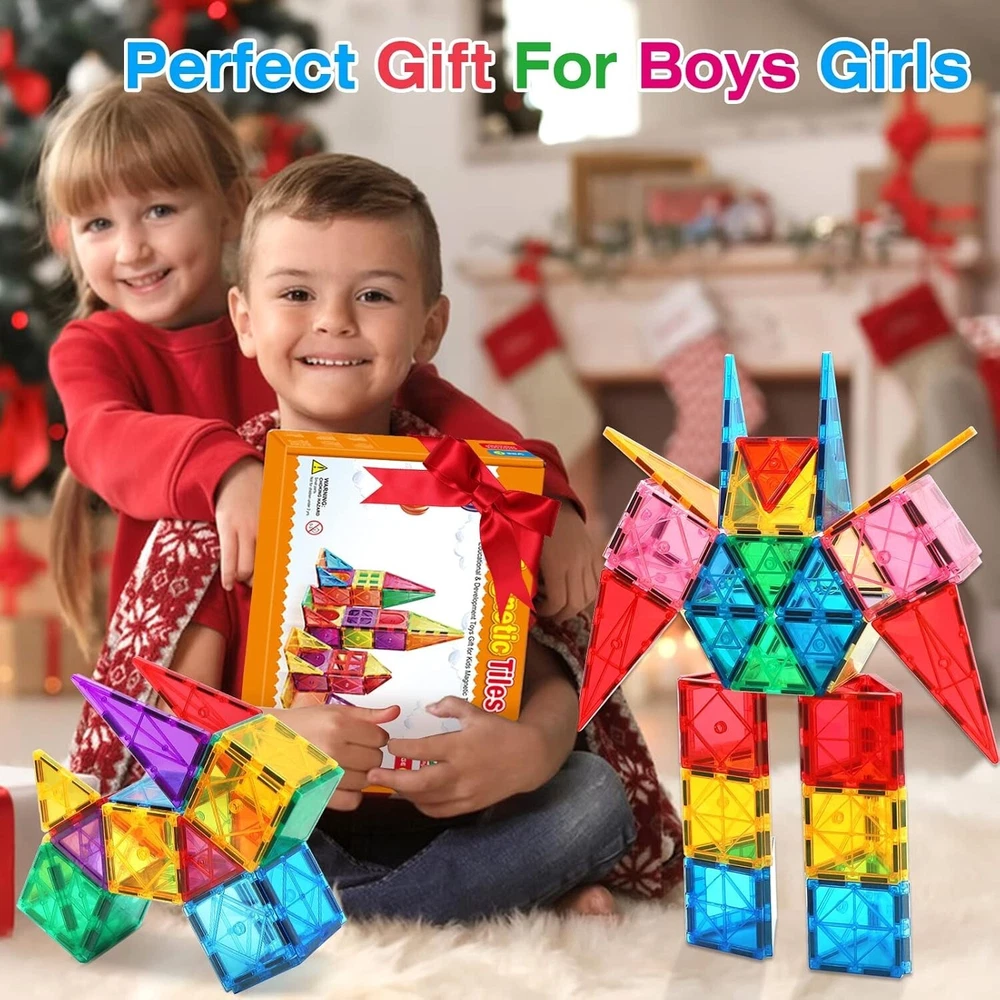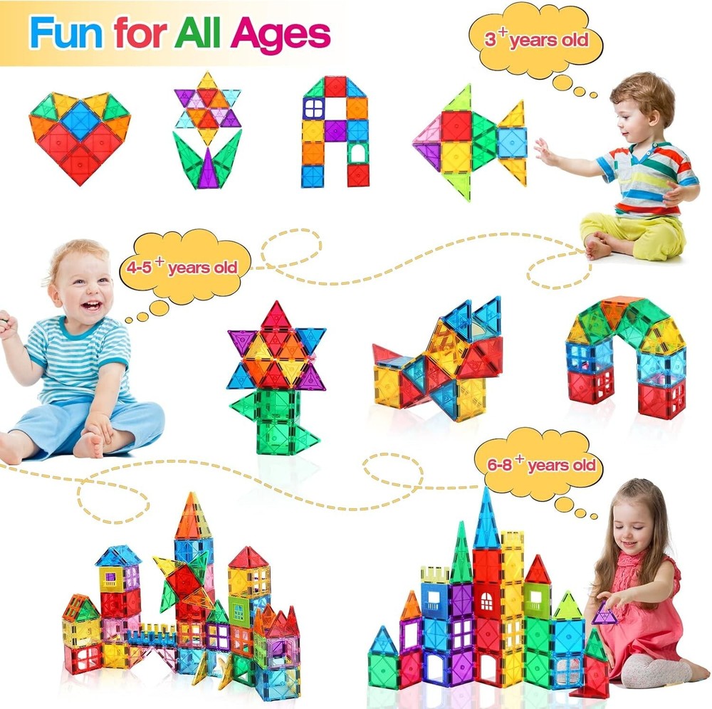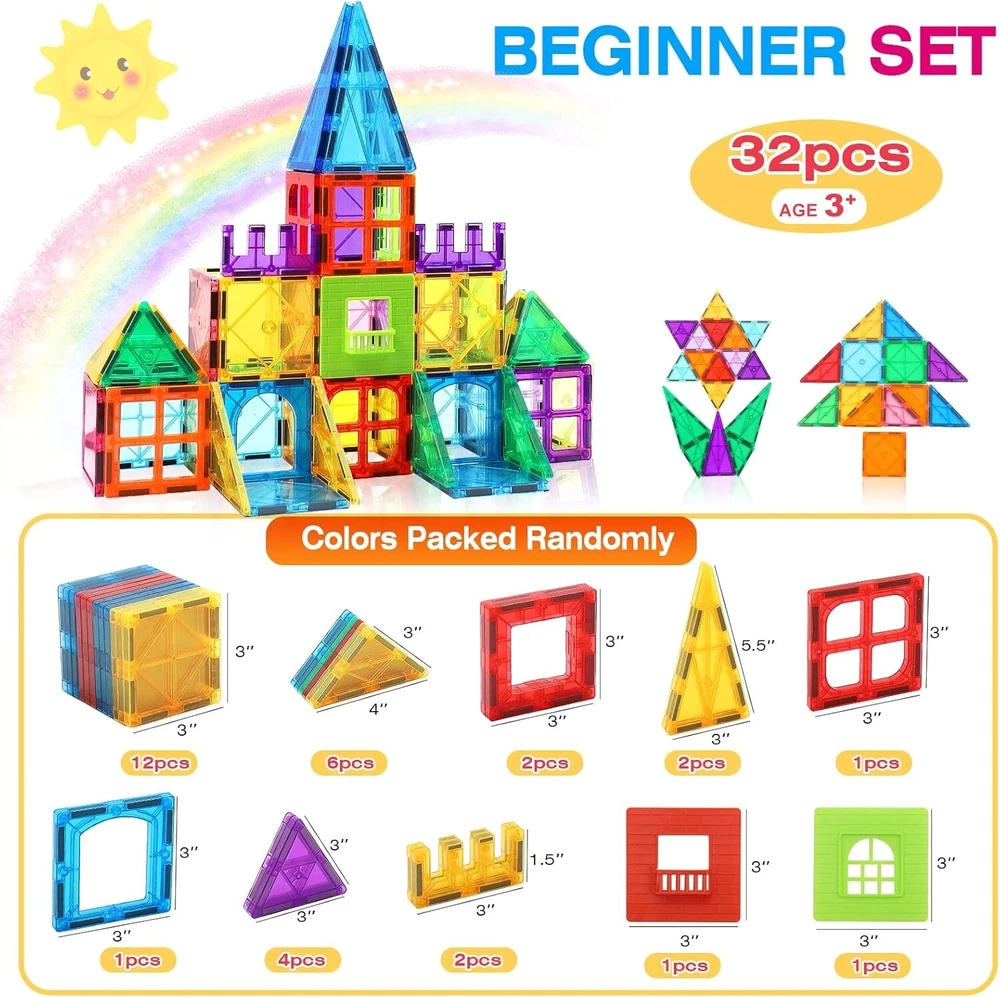 STEM Educational Toy: Fun and educational magnetic tiles for toddlers 3-4 to recognize colors, geometry and shape puzzles. Starter Kit For Kids: Package with 32 pieces incl. squares, triangles, E shape & plastic windows, an idea booklet and a storage bag for building anything from fish birds to planes & trucks or even houses & towers. Safe & Sturdy Quality: The magnetic building tiles are made of premium quality ABS plastic and larger strong magnets. Durable sturdy inner rivets & smooth edge surfaces will protect your baby's small hands. Multifunction & More Creativity: The magnetic tiles for kids are perfect for classroom, family, kindergarten, day care centers etc. Build anything their brain come up with, from 2D planar to 3D geometry. Ideal Gifts & Warranty: Perfect educational toys for kids 5-7. Ideal presents for birthday, Christmas, Easter gifts. If you have any problems about our product, please send message to us at first time! Customer satisfaction has always been our top priority.