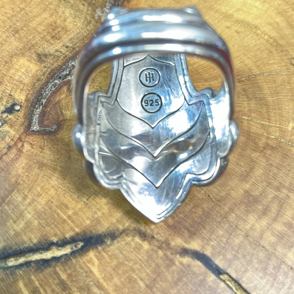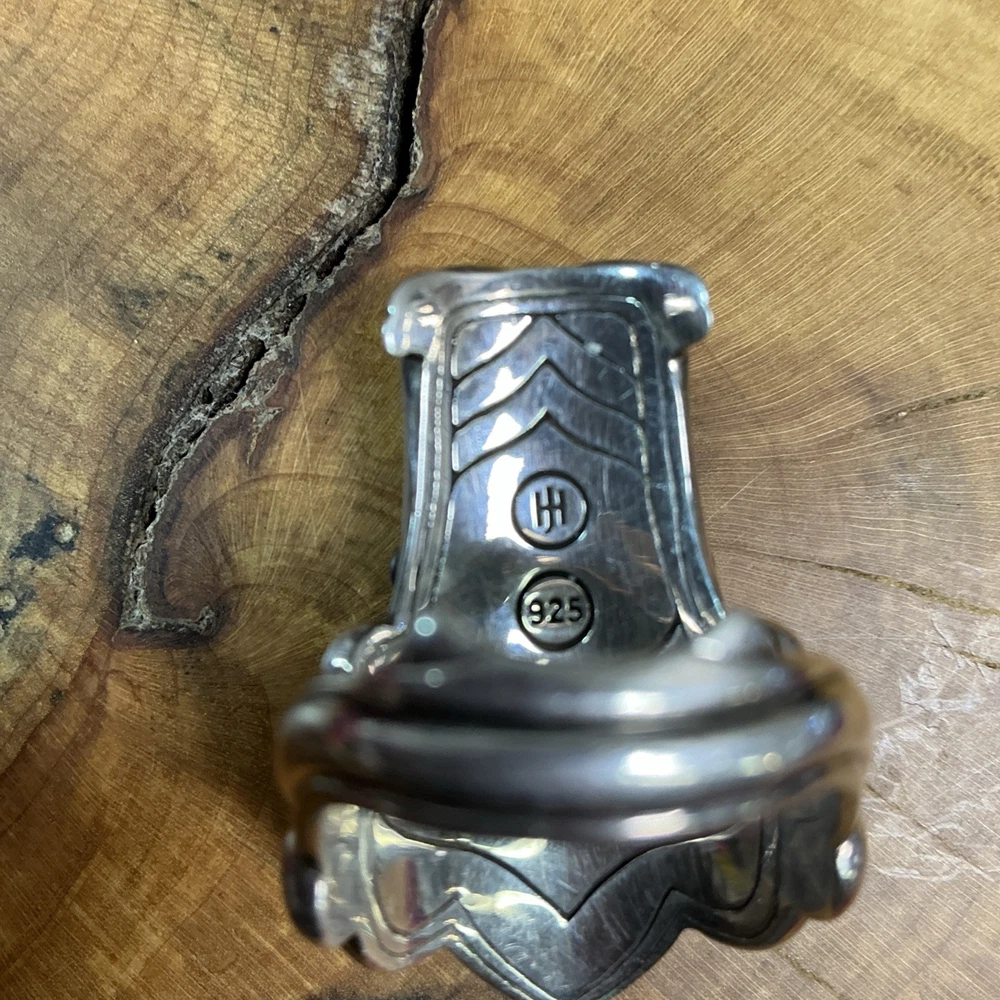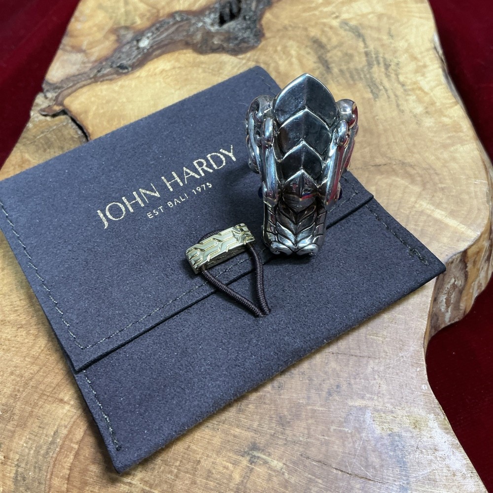 The STERLING SILVER John Hardy Legends Naga Dragon Blue Sapphire Eyes Ring in size 10 is a handmade signet ring featuring a unique dragon head design with blue sapphire eyes. Crafted from sterling silver with a purity of 925, this modern piece is part of the Naga Legends collection by John Hardy. Sizable and originating from Indonesia, this round ring is perfect for any occasion and showcases the brand's signature style and craftsmanship. Listening includes original John Hardy pouch as pictured.