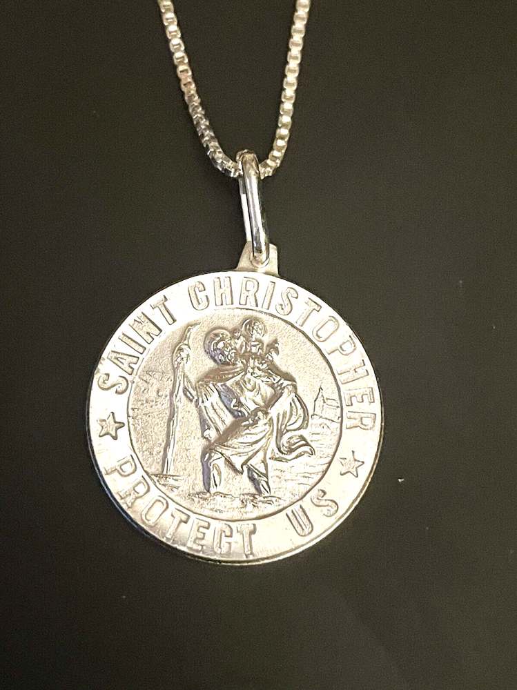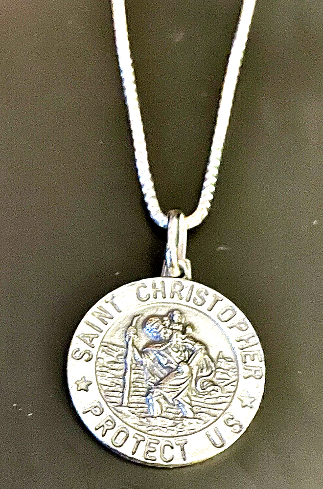 WELCOME! Up for immediate purchase we have a NEW Solid Sterling silver Charm Medal ST. CHRISTOPHER Necklace on a 24" solid sterling silver 1mm thick mirrored box pendant chain, with a spring ring clasp. High Polish Mirror finish, Large 21mm round, or about .8' inch. THIS IS A SOLID S terling Silver medal and chain. NOT Plated and NOT Filled. This medal measures 21mm in diameter, not including the bail (the bail is about 4mm). The set weighs approx. 8.6 grams of sterling silver. FAST, FREE, US SHIPPING IN A DRAWSTRING GIFT BAG. Bid with confidence. We have been in the jewelry business since 1988. We have two eBay sites, as chicpromotions, and chicpromotions2, with 100% positive feedbacks, and over 35,600 feedbacks. Visit our eBay stores! chicpromotions2 ( Feedback Score Of 10,600 ) chicpromotions ( Feedback Score Of 26428 )