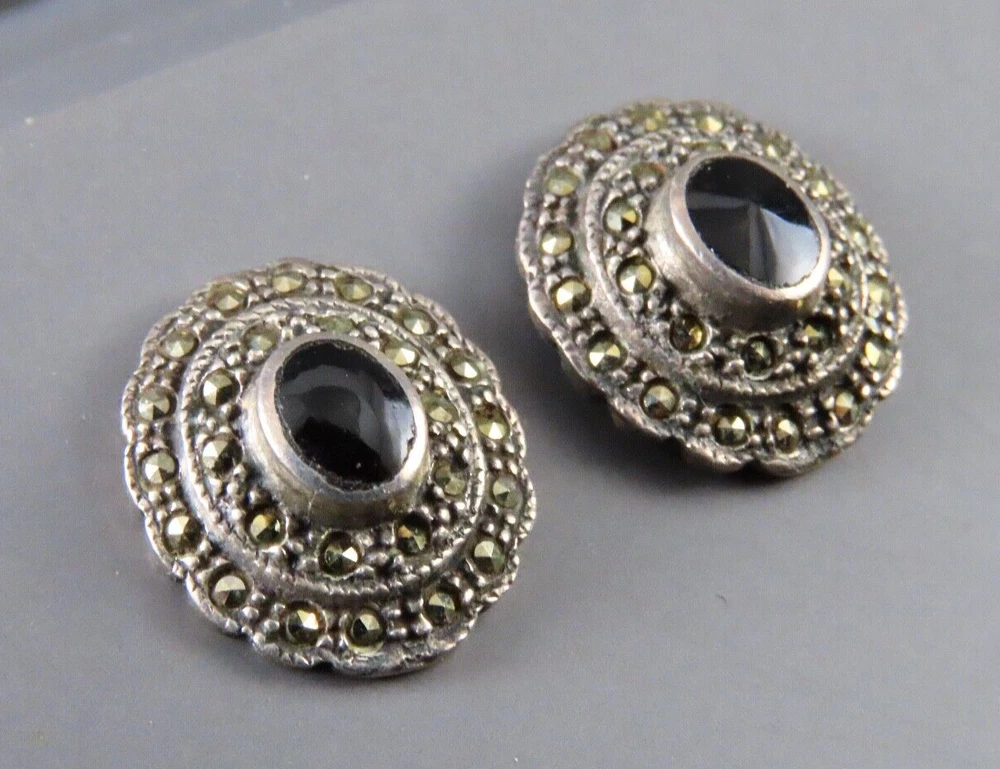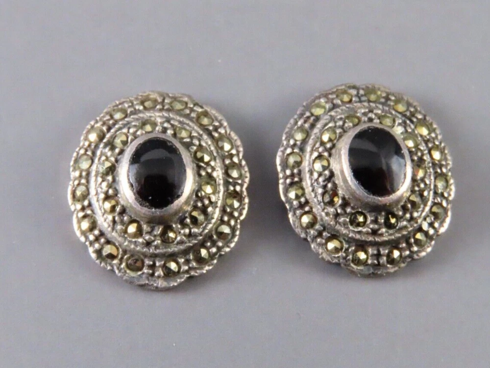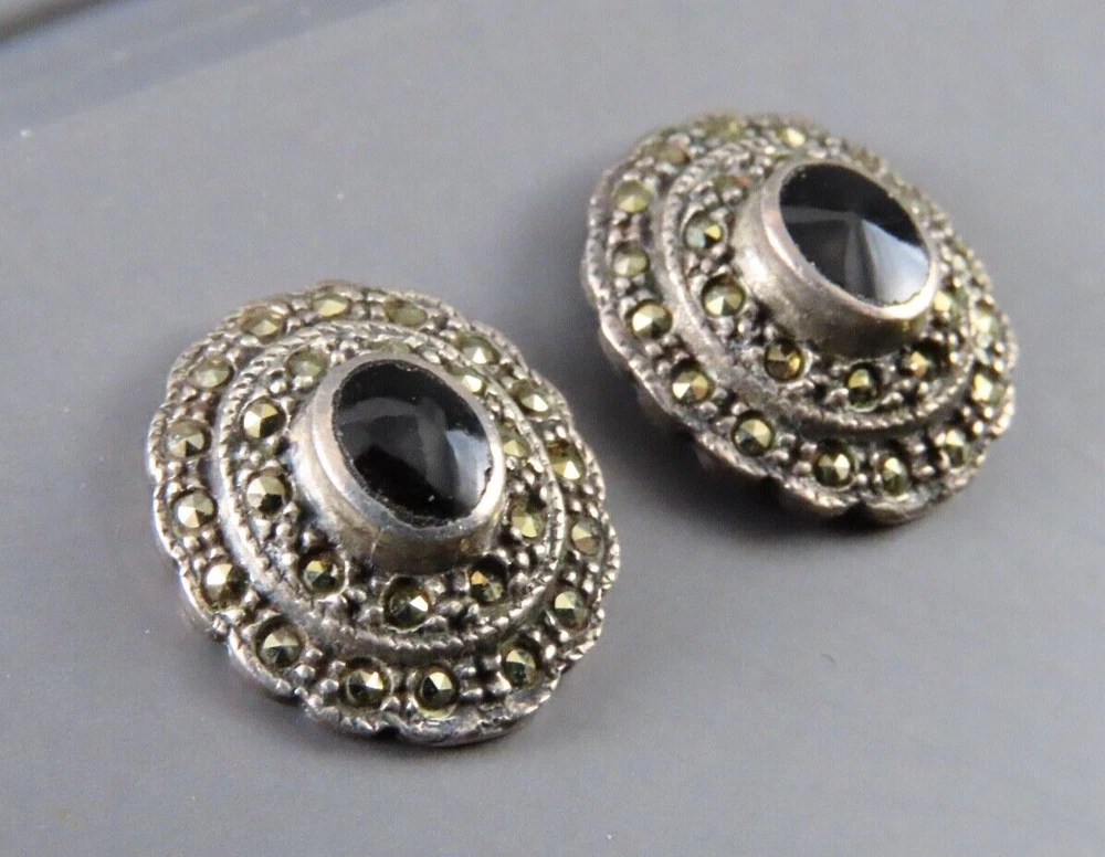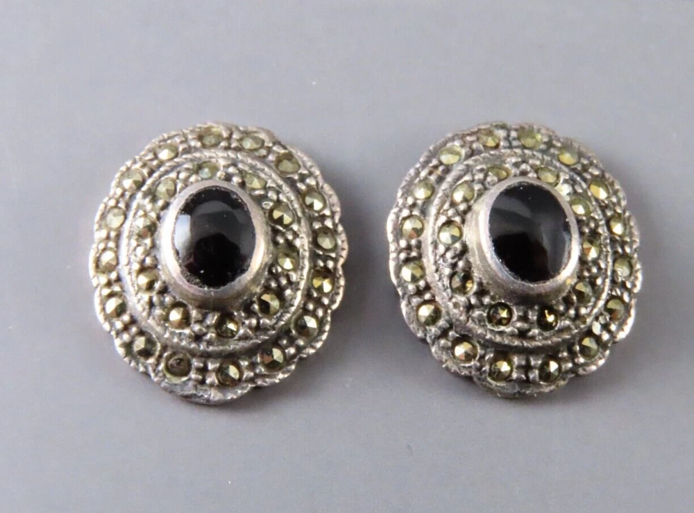 STERLING SILVER Oval Stud Earrings BLACK ONYX w/MARCASITE DOUBLE HALO Gothic!