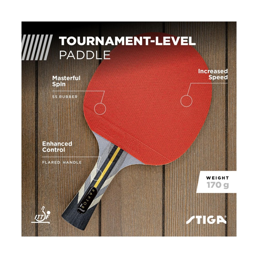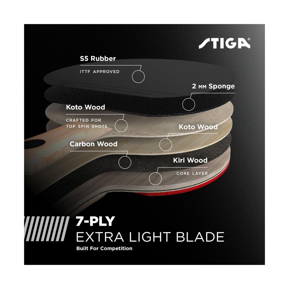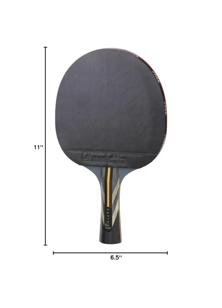 STIGA Carbon Fiber Ping Pong Paddle - 2mm Sponge, Flared Handle - Performance Table Tennis Racket, Black Description The STIGA Raptor table tennis racket expertly unites cutting-edge technologies with perfected materials. Used by top players around the world, the Raptor puts extreme power and spin into the palm of your hand. Built for competition, the Raptor seamlessly fuses STIGA's Nano Composite Technology—which forms stronger and tighter bonds in the rubber—with ACS Technology—which combines microscopic air capsules in an ultra-light rubber—delivering high speed with maximum elasticity and outstanding control. STIGA's Crystal Technology hardens the blade for increased speed and its WRB Technology increases blade balance, recovery rate, and ball sensitivity. The Raptor boasts an integrated carbon fiber blade and performance ratings of Speed: 99, Spin: 100, and Control: 80. Features: STIGA Since 1944, STIGA has been the innovative leader in table tennis equipment. STIGA combines superior craftsmanship with exceptional performance in every product. The highest quality equipment for all, from amateur to pro. Thats the STIGA heritage BUILT FOR COMPETITION Nano Composite and ACS Technologies form stronger and tighter bonds in the ITTF approved smooth inverted S5 rubber for high speed and spin with maximum elasticity and outstanding controlthe perfect racket for tournament play SUPERIOR TECHNOLOGY This racket unites STIGA's Crystal and WRB Technologies for a hardened, light blade with faster returns, more power, and extra sensitivity of touch PRECISION BLADE The 7-ply blade boasts 5 layers of light-weight balsa wood and 2 layers of high-performance, integrated carbon carbon fiber that combine with a 2mm sponge for a larger sweet spot and cleaner hits PERFORMANCE RATINGS Speed: 99, Spin: 100, Control: 80 Product Details: Brand: Stiga Material: Rubber Sport: Table Tennis Item Weight: 0.49 Pounds Frame Material: Carbon, Carbon Fiber Age Range (Description): Adult UPC Global Trade Identification Number: 81 Brand: Stiga Material: Rubber Sport: Table Tennis Item Weight: 0.49 Pounds Frame Material: Carbon, Carbon Fiber Age Range (Description): Adult UPC: 754806261881 Global Trade Identification Number: 81 Item Package Dimensions L x W x H: 10.71 x 6.42 x 1.26 inches Package Weight: 0.23 Kilograms Item Dimensions LxWxH: 11 x 6.5 x 0.1 inches Brand Name: Stiga Warranty Description: 90 Day Limited Model Name: Raptor Manufacturer: STIGA Part Number: T1291 Style: Ping Pong Paddle Included Components: Table Tennis Racket Skill Level: All Hand Orientation: Ambidextrous Grip Size: Standard Date First Available: June 12, 2019 Delivery We Do Not Ship Outside of the Continental US. Return Policy All items qualify for returns within 30 days of receipt. Buyer is responsible for return shipping on any item that is not damaged. Feedback We take our reputation seriously, we buy and sell online, so we understand the value of trust. If you are unsatisfied with your order, please contact us and we will work with you to resolve it to your satisfaction.