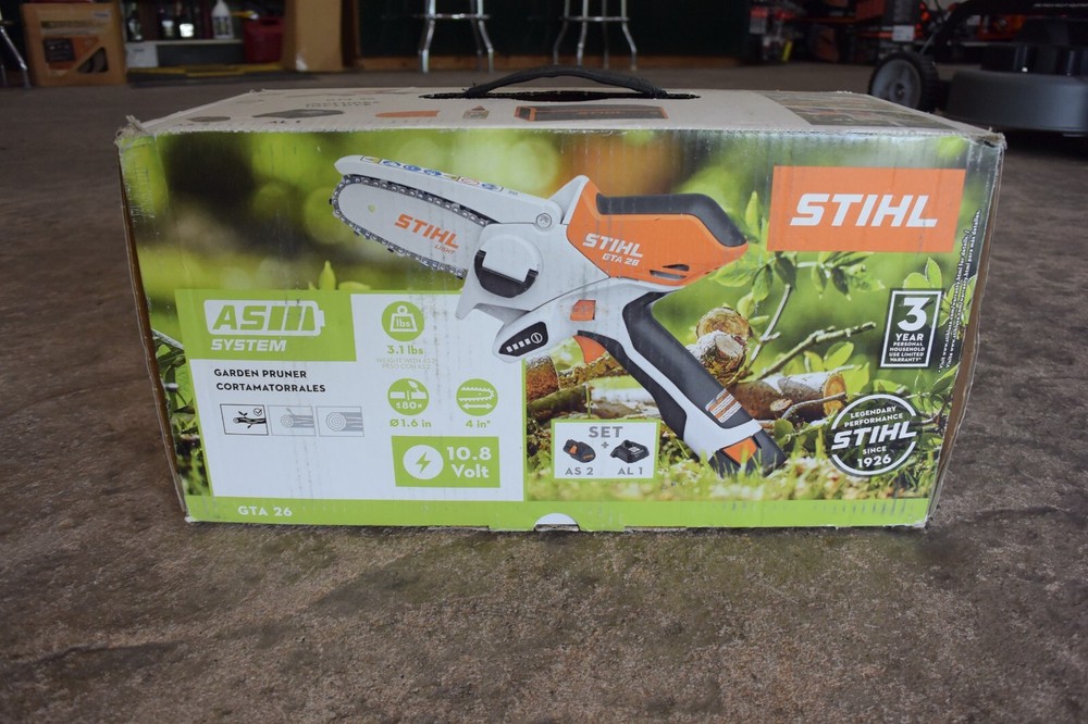 Features:CordlessBar Length:4 inUPC:886661634279Type:ChainsawProduct Line:STIHLCountry/Region of Manufacture:GermanyItem Weight:3.1Assembly Required:NoBrand:STIHLPower Source:BatteryModel:GTA-26gtin13:886661634279Vintage:NoMPN:GTA 26Cutting Length:4Manufacturer Warranty:3 years residentialBattery Included:YesBlade Length:4Accessories Included:Carry Bag, Guide Bar Cover, User Manual, BAR OIL, Charger, BatteryVoltage:10.8 V
